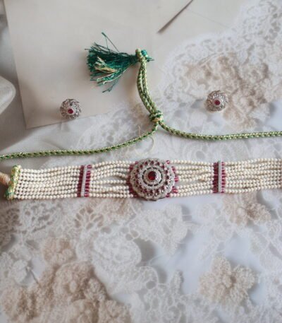 ₹32,000.00 {EXCLUSIVE OF GST}92.5 silver choker set with earrings studded with zircons, coloured stones, and freshwater pearls for a graceful and elegant look.