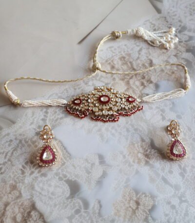 ₹22,500.00 {EXCLUSIVE OF GST}92.5 silver choker set with earrings, featuring kundan stones and freshwater pearls for a timeless traditional style.