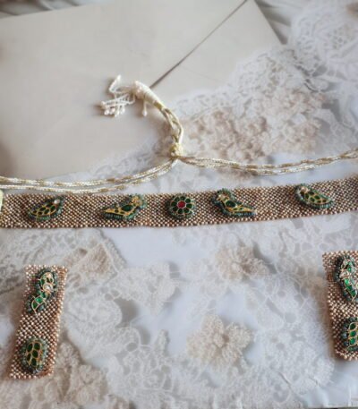 ₹24,500.00 {EXCLUSIVE OF GST}92.5 silver choker set with earrings featuring freshwater pearls, emeralds, and Kundan stones for a graceful traditional look.