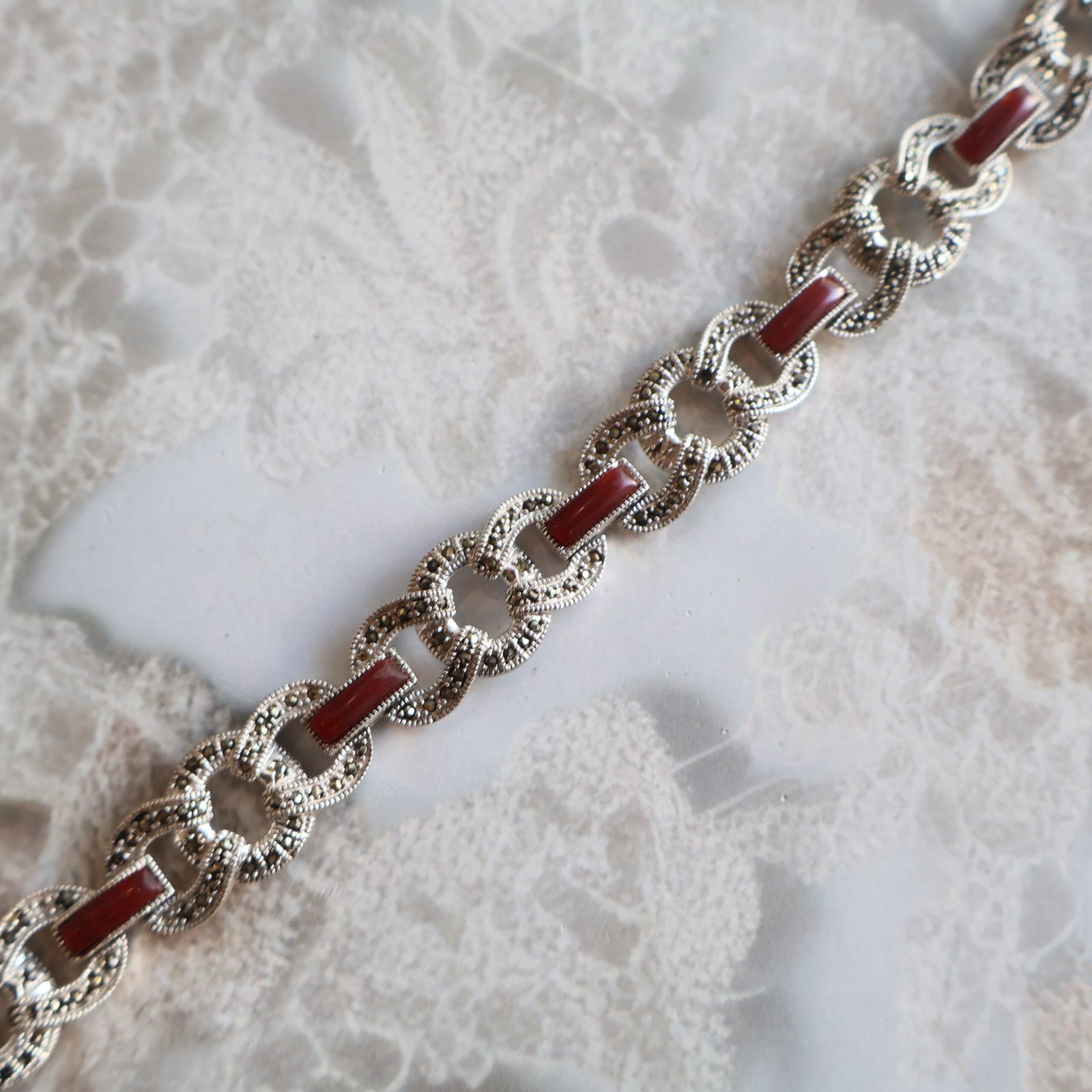 92.5 silver bracelet with red coral stones for a bold and elegant look.