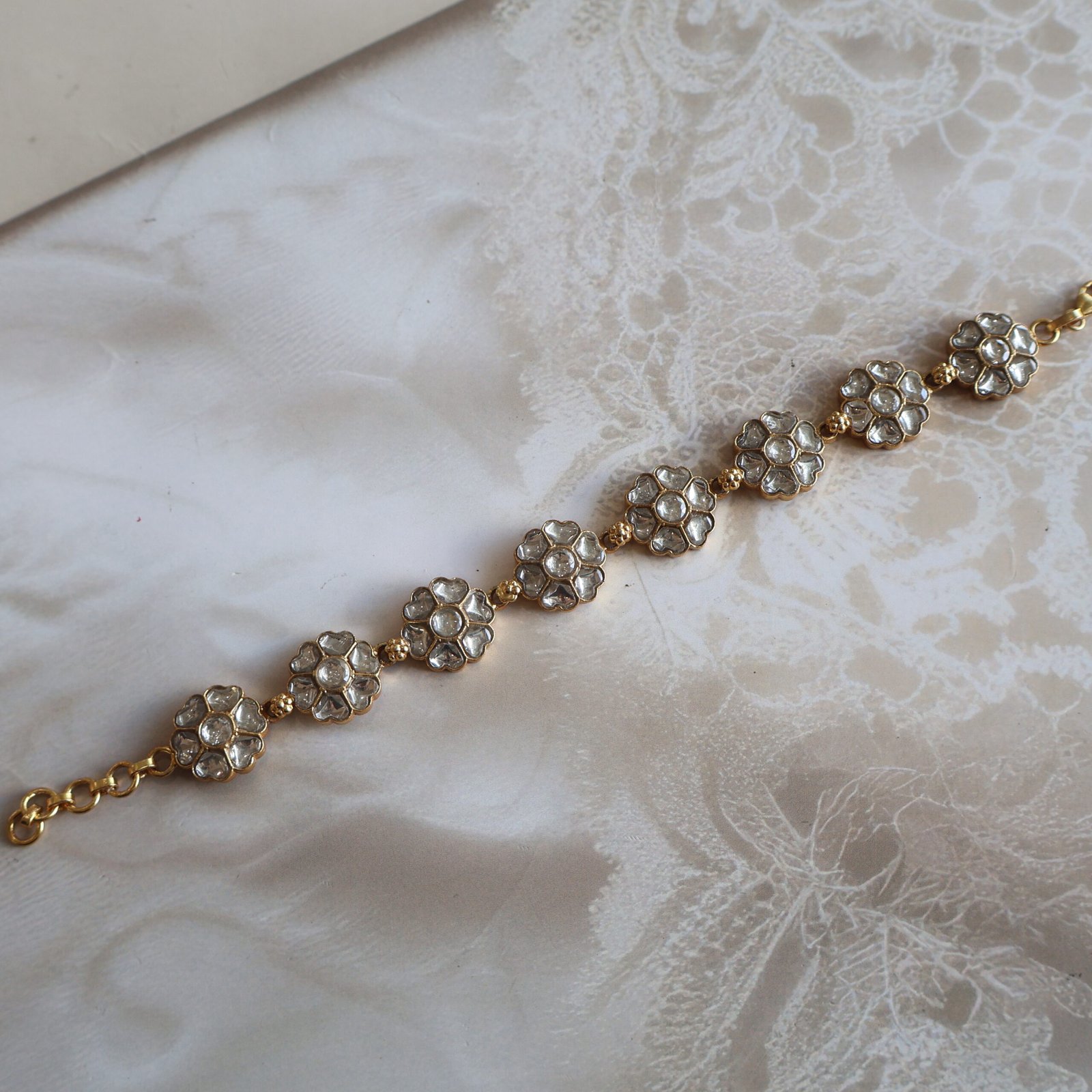 This exquisite 92.5 silver bracelet is crafted to reflect bridal elegance and heirloom charm. Finished in radiant gold polish, it showcases intricately placed Kundan stones that lend a royal glow to the design. Handcrafted with precision, the bracelet offers lasting beauty, making it an ideal choice for bridal wear, festive celebrations, and treasured gifting.