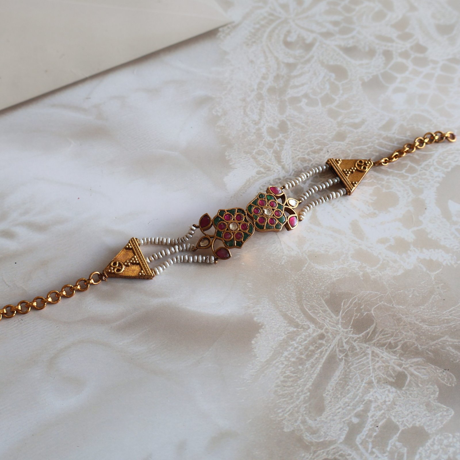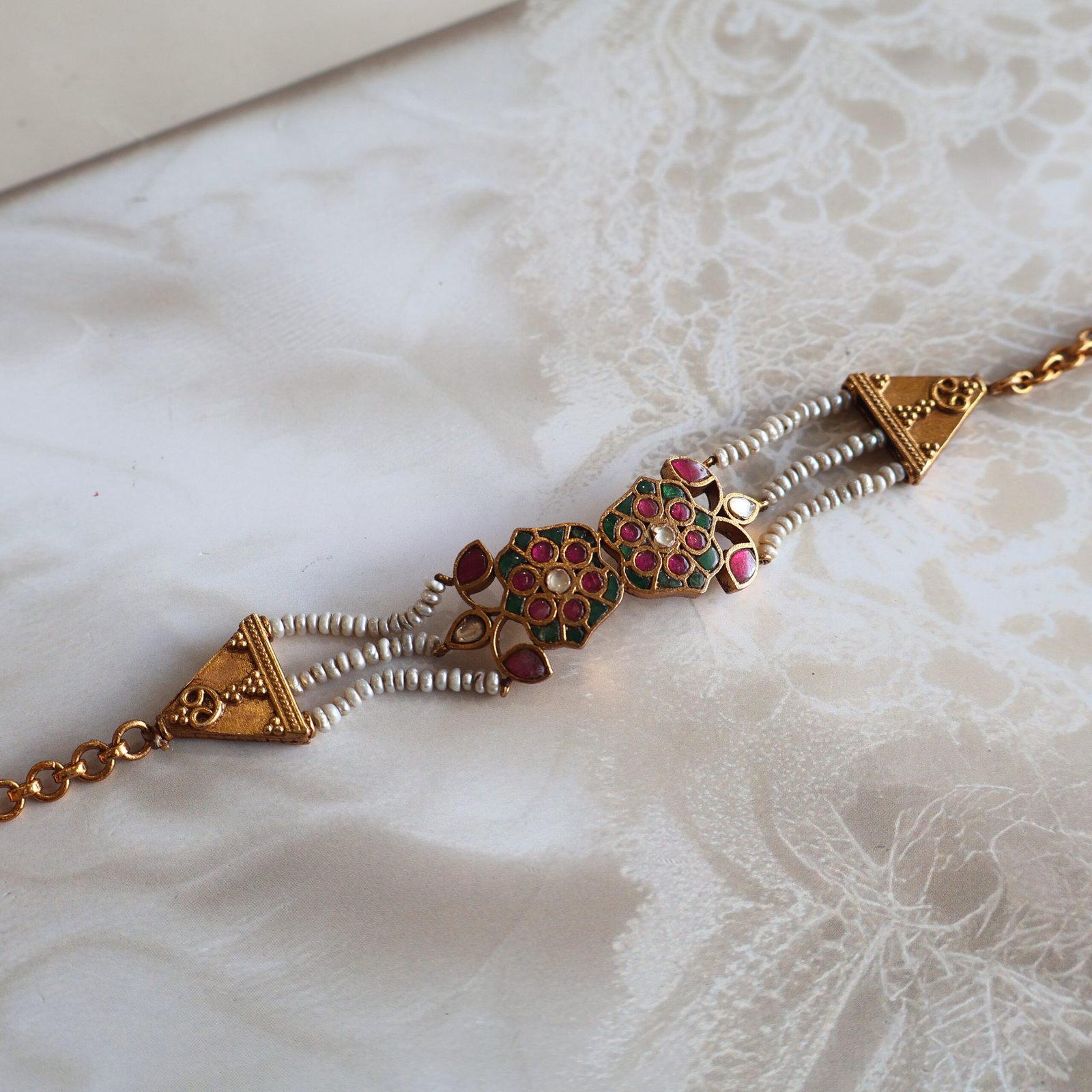 This beautifully handcrafted bracelet in 92.5 sterling silver showcases timeless Indian artistry and refined elegance. Designed with carefully hand-set Kundan stones and complemented by soft, lustrous freshwater pearls, the bracelet reflects a perfect balance of tradition and grace.