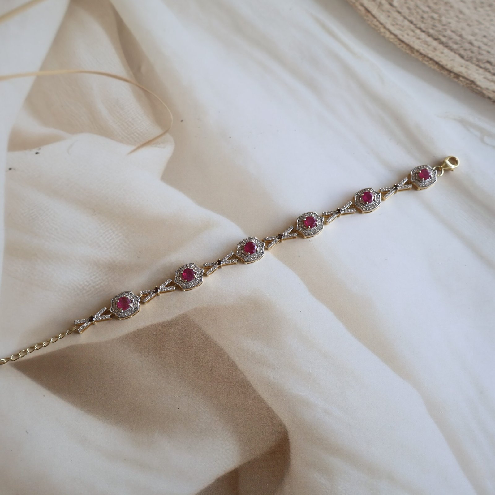 This elegant bracelet is crafted in 92.5 pure silver and beautifully studded with rich red ruby stones, sparkling zircons, and carefully selected natural gemstones. The vibrant colours and fine shine come together to create a graceful and luxurious design. Finished with a smooth polished silver surface, this bracelet is comfortable to wear and perfect for everyday elegance as well as special occasions.