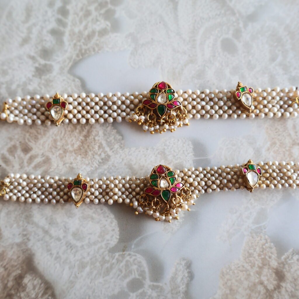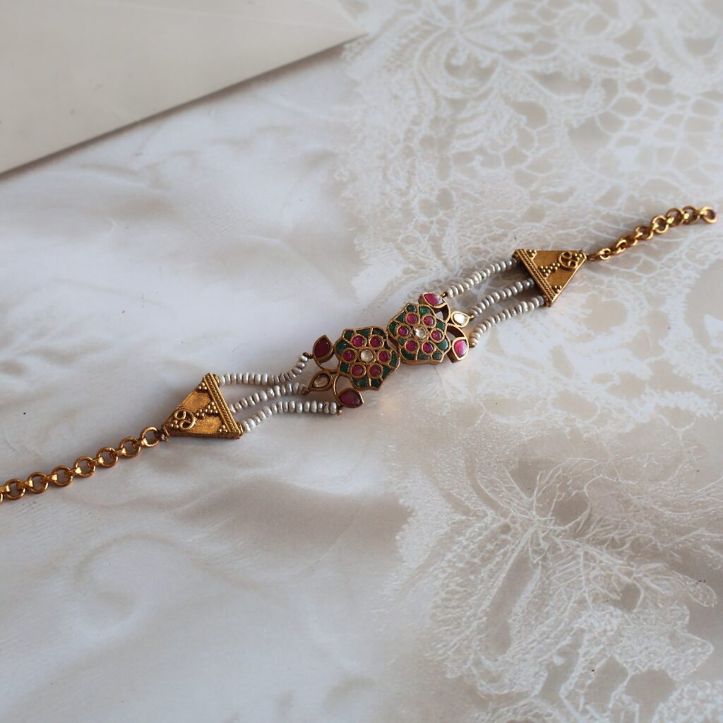 This beautifully handcrafted bracelet in 92.5 sterling silver is inspired by timeless Indian jewellery traditions. Finished with a luxurious gold polish, it features finely hand-set Kundan stones that reflect royal elegance and heritage charm. Designed for comfort and durability, this bracelet is perfect for weddings, festive occasions, and traditional celebrations, adding a graceful statement to ethnic ensembles.