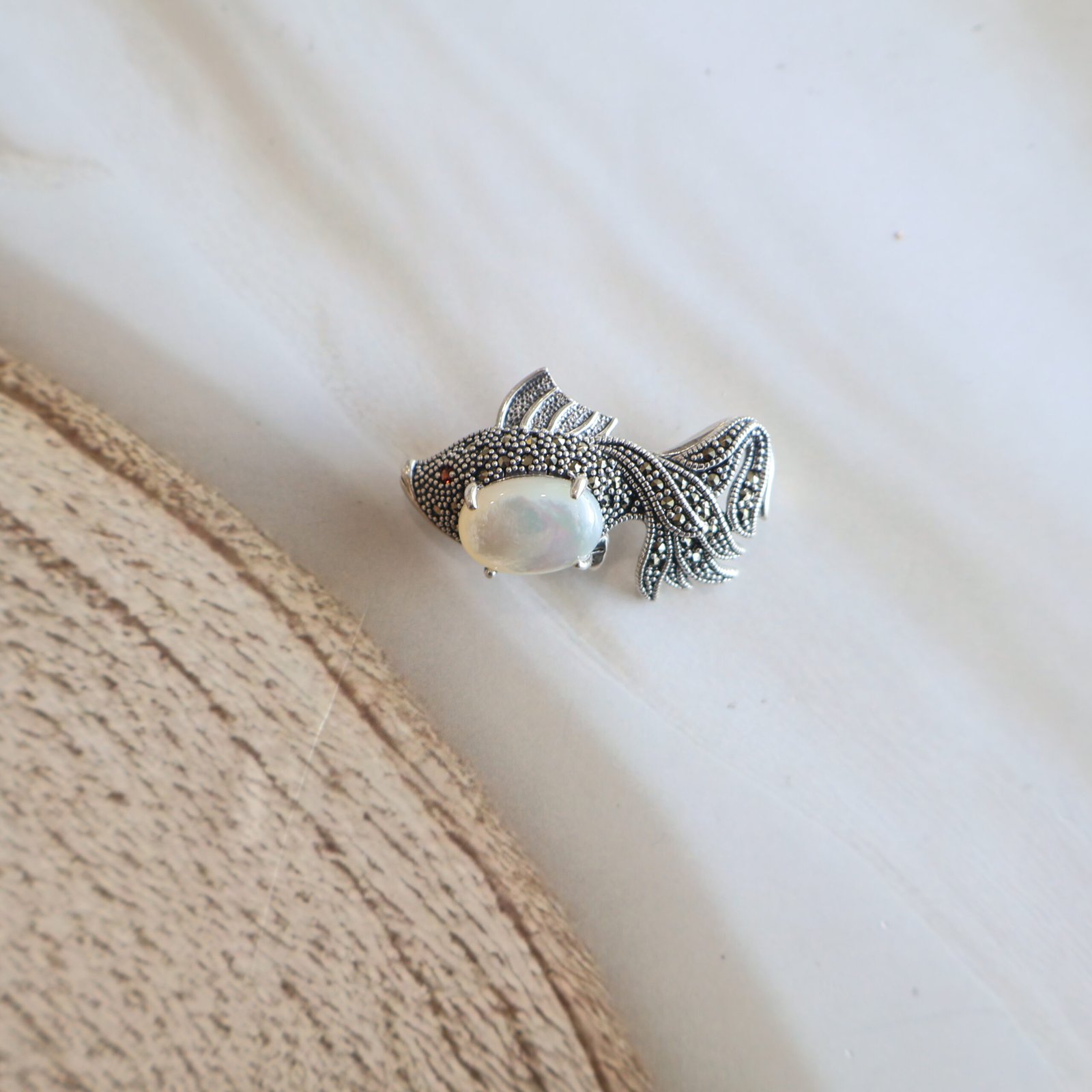 A finely handcrafted 92.5 sterling silver brooch designed in a graceful fish motif, symbolising prosperity, abundance, and good fortune.