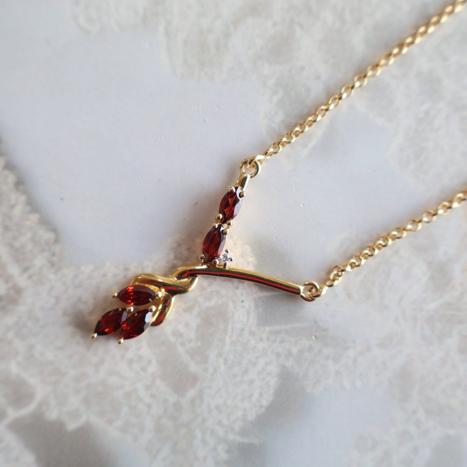 An elegant 92.5 sterling silver chain finished with rich gold polish, beautifully studded with deep red garnet stones.