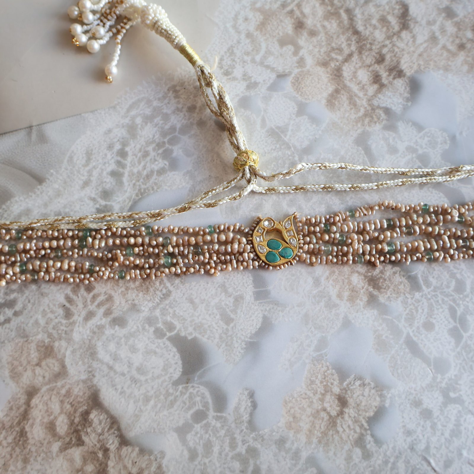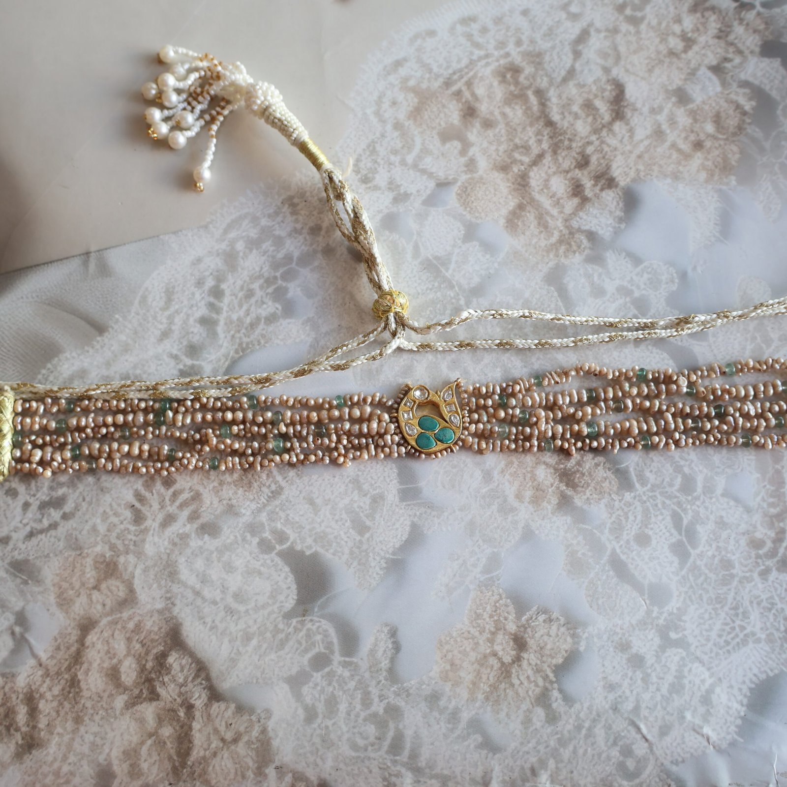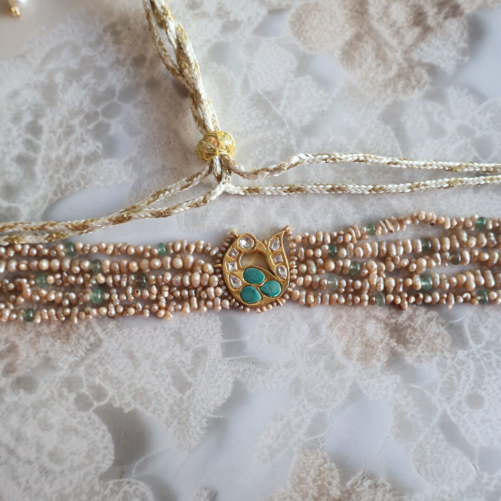 92.5 silver choker with garnet, moissanite polkies, and freshwater pearls for a rich and elegant look.