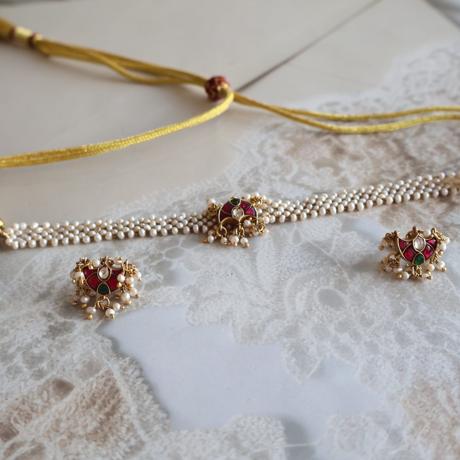 92.5 silver choker set with earrings, adorned with kundan stones and freshwater pearls for a classic traditional look.