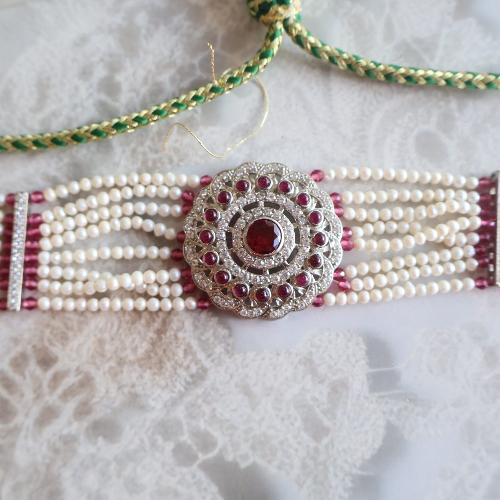 This elegant 92.5 sterling silver choker set with matching earrings is beautifully designed with sparkling zircons, vibrant coloured stones, and delicate freshwater pearls. The shimmering zircons add brilliant shine, while the coloured stones bring rich colour and charm to the design. The soft glow of freshwater pearls enhances the set with grace and elegance. Crafted with fine detailing and a polished finish, this choker set is perfect for weddings, festive occasions, and special celebrations, adding a stylish and traditional touch to any outfit.