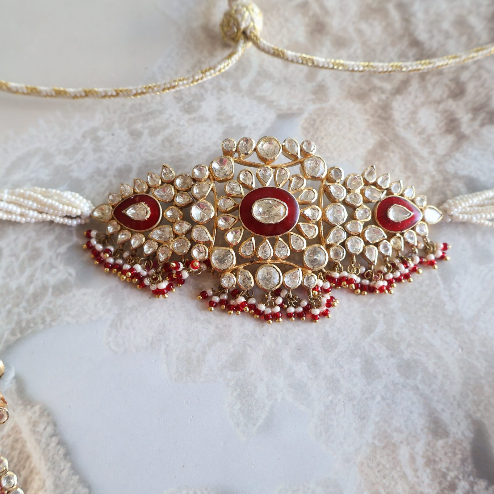 92.5 silver choker set with earrings studded with moissanite polkies, coloured stones, and freshwater pearls for a rich and elegant look.