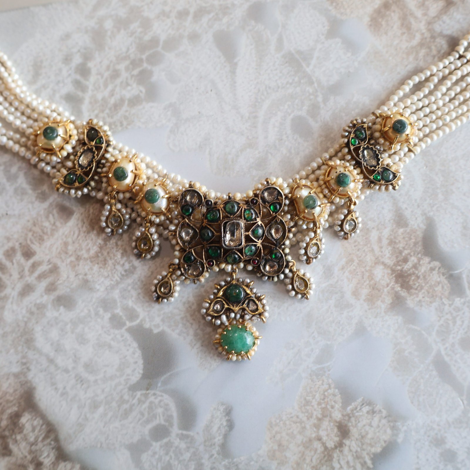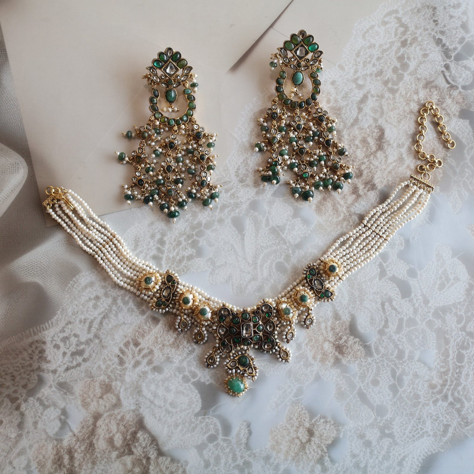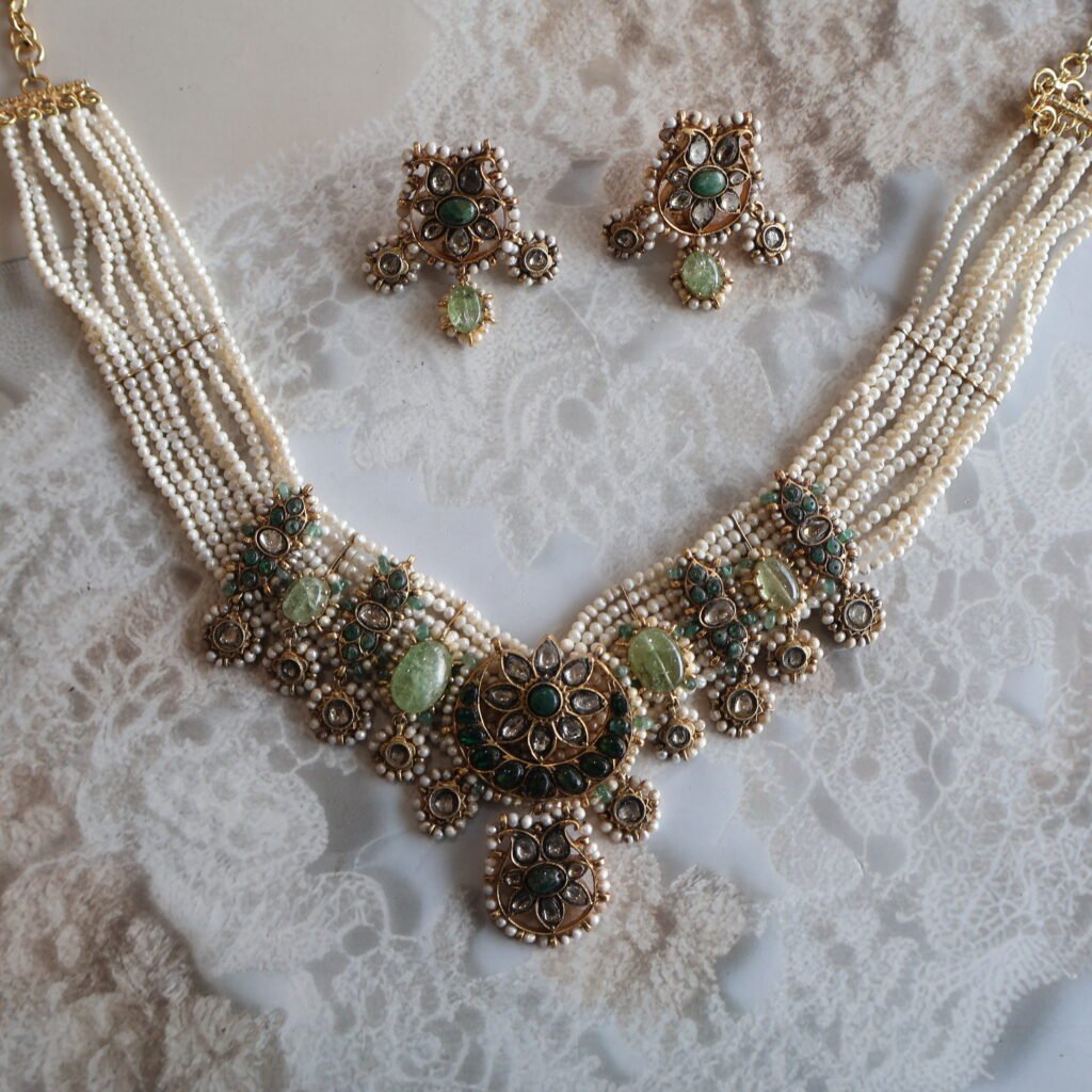 Celebrate timeless craftsmanship with this stunning 92.5 sterling silver jewellery set, thoughtfully designed to enhance traditional elegance. The luminous diamond polkies add a subtle sparkle, while delicate freshwater pearls bring softness and grace to the overall design. Carefully placed precious and semi-precious gemstones introduce vibrant hues, making the set visually rich yet perfectly balanced.