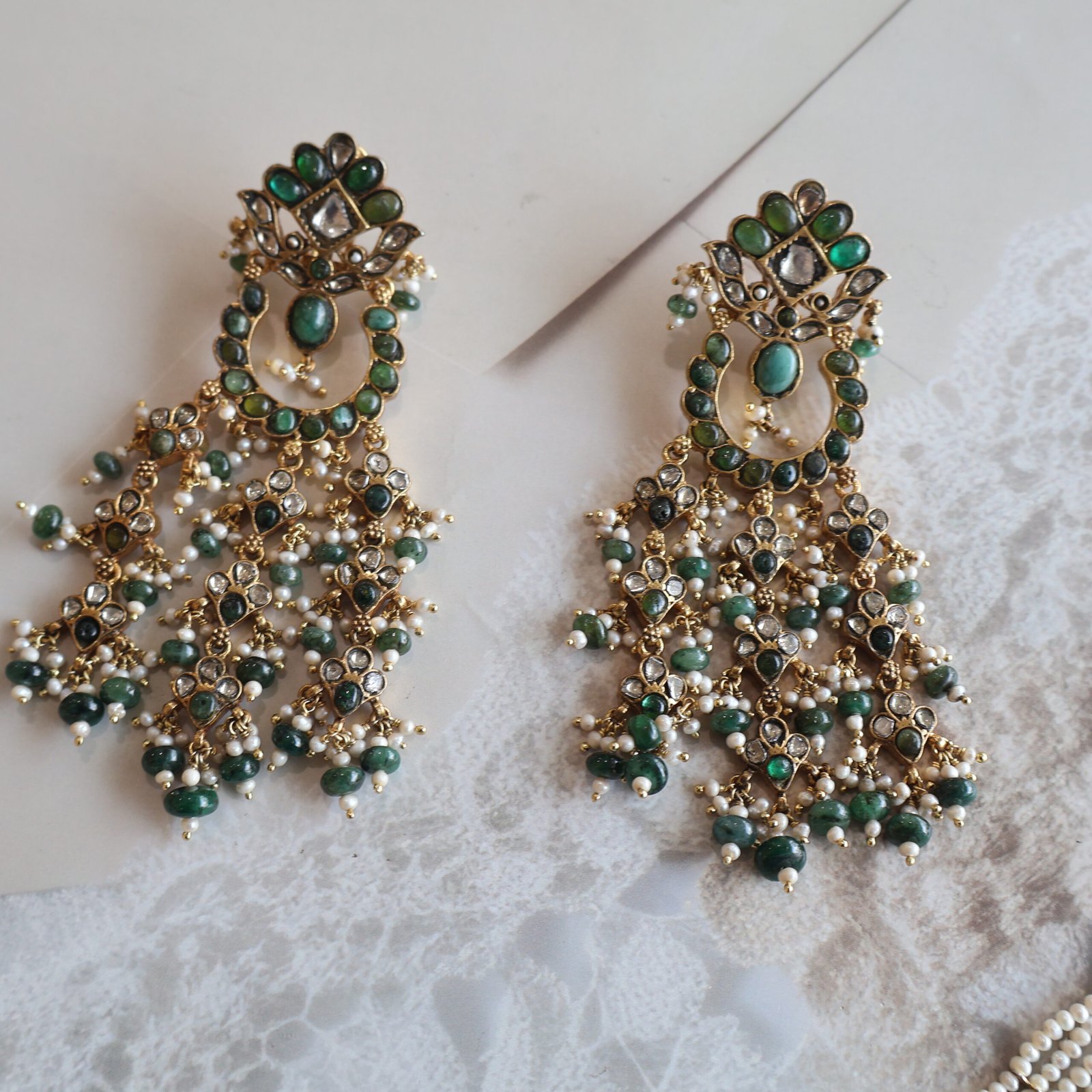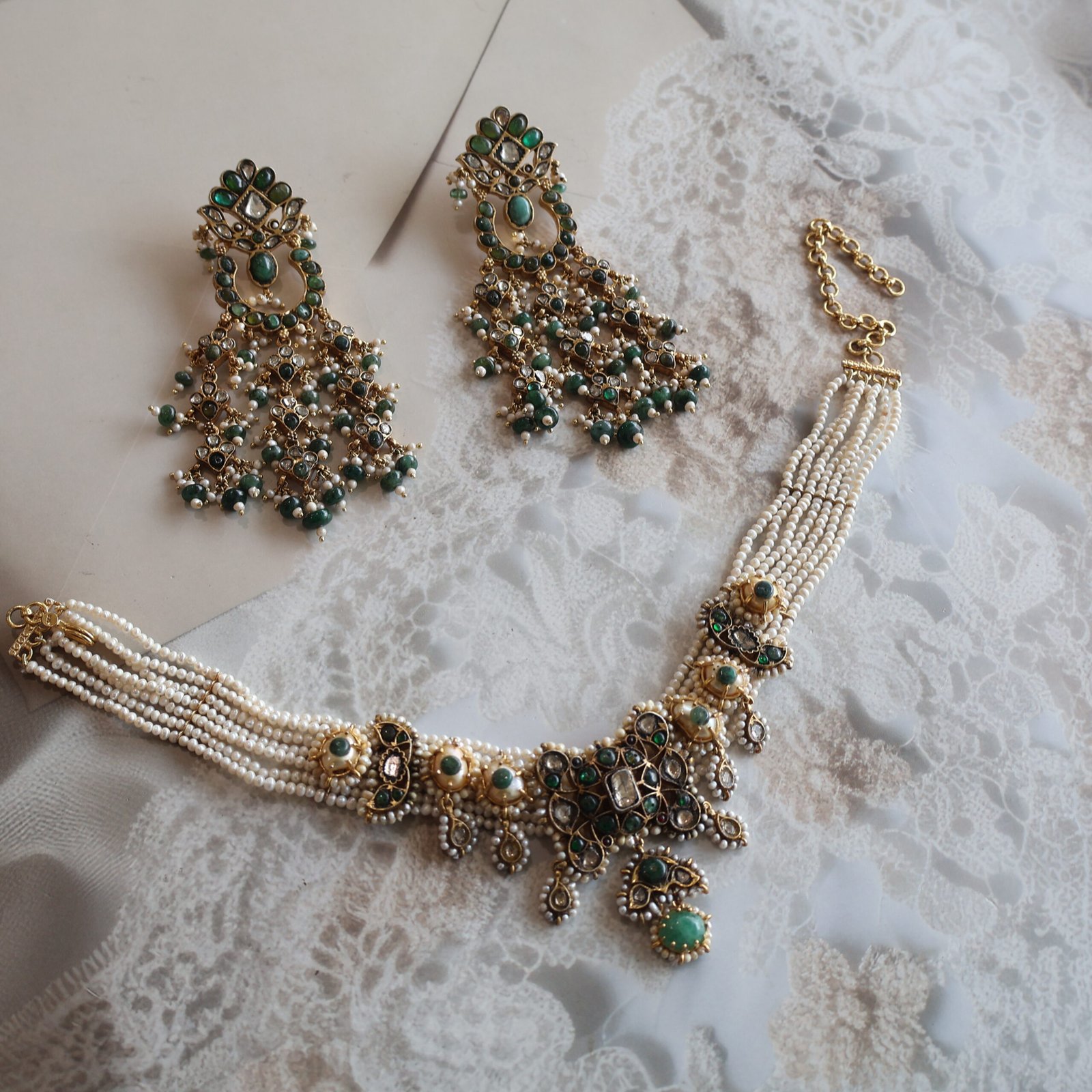 A luxurious 92.5 sterling silver jewellery set with earrings, exquisitely studded with diamond polkies, freshwater pearls, and a rich mix of precious and semi-precious gemstones for a regal ethnic statement.