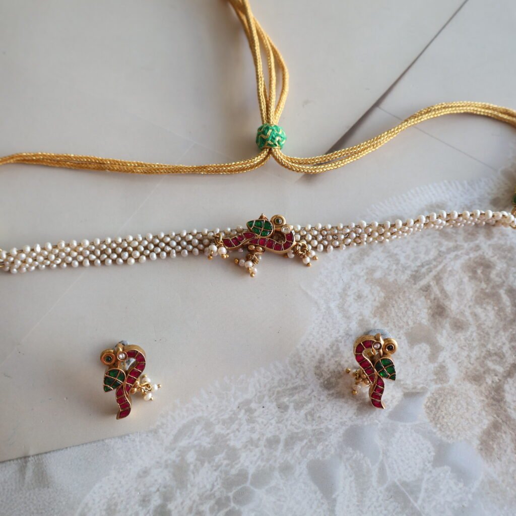 Handcrafted by skilled artisans, this jewellery set with matching earrings is ideal for weddings, festive occasions, and heirloom-inspired styling. Its classic silhouette paired with modern detailing ensures versatility, allowing it to be styled with sarees, lehengas, and contemporary ethnic wear alike.