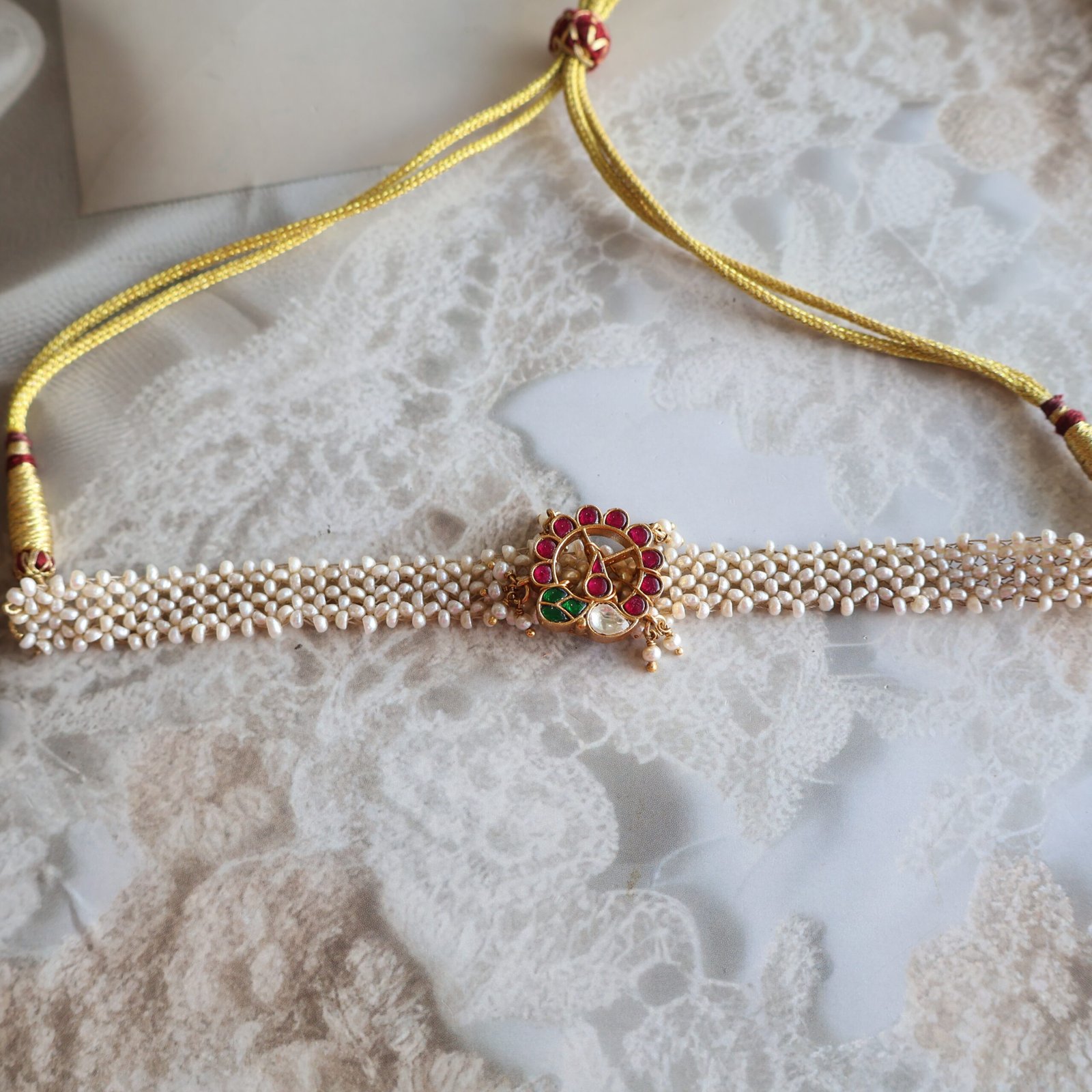 92.5 silver choker set with earrings, studded with kundan stones and freshwater pearls for a timeless traditional look.