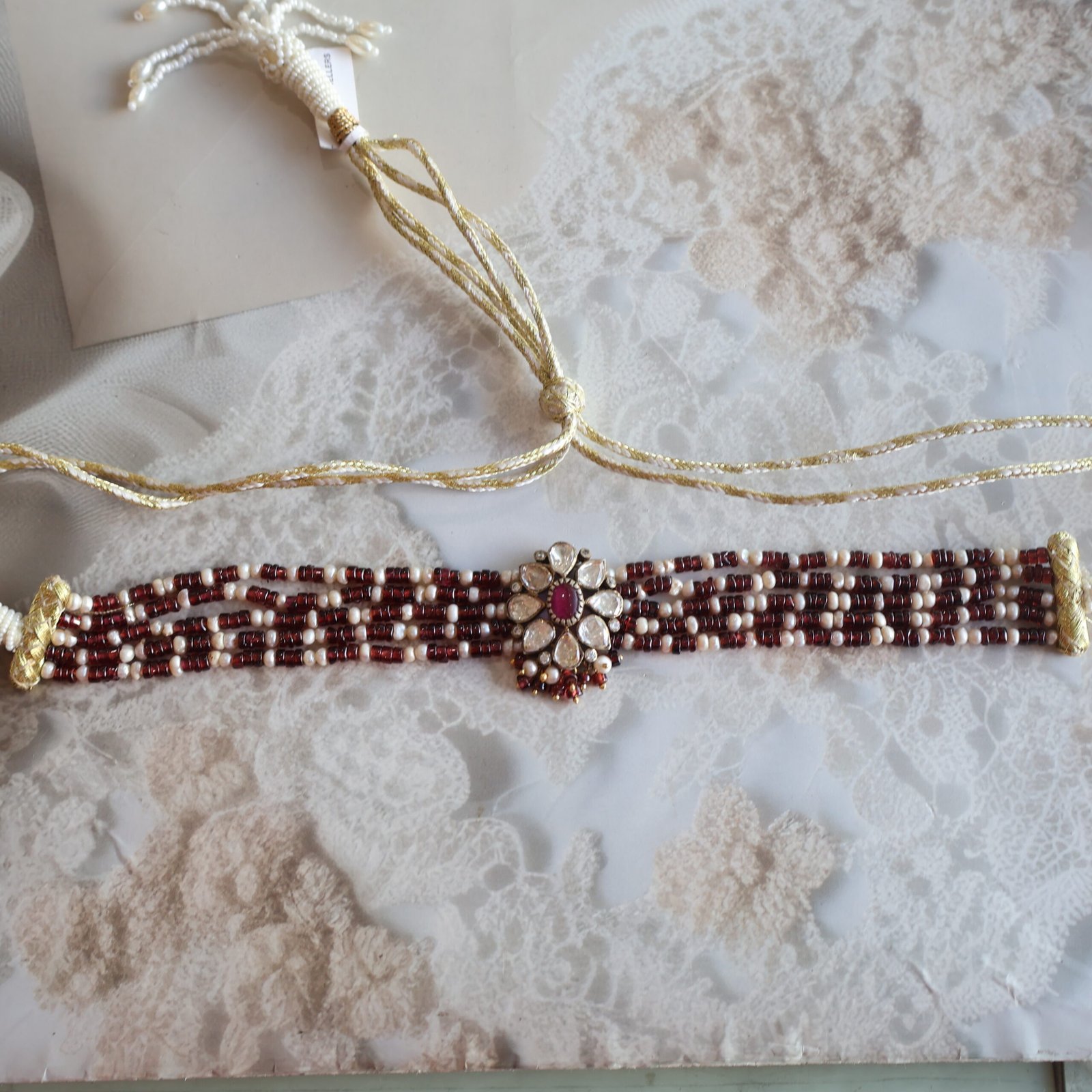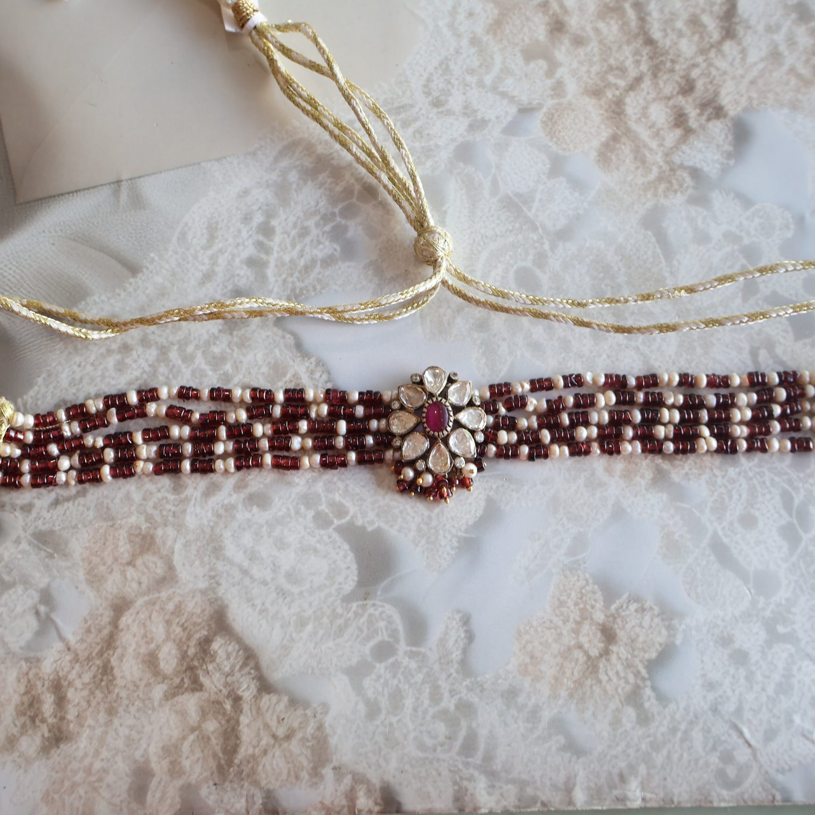 92.5 silver choker with garnet, moissanite polkies, and freshwater pearls for a rich and elegant look.