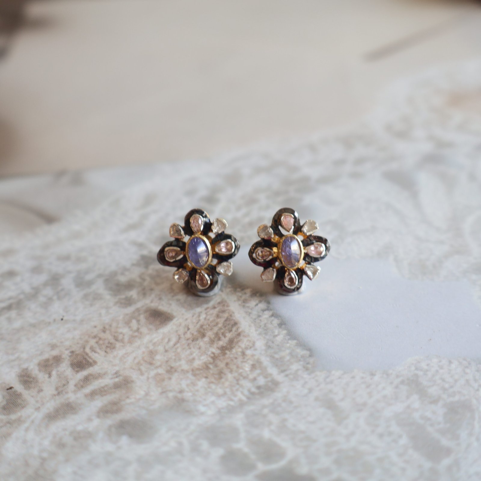 Premium handcrafted Natural Diamond Polki earrings featuring vibrant Rubellite and royal Tanzanite gemstones, crafted in high-quality 925 sterling silver for a luxurious statement look.
