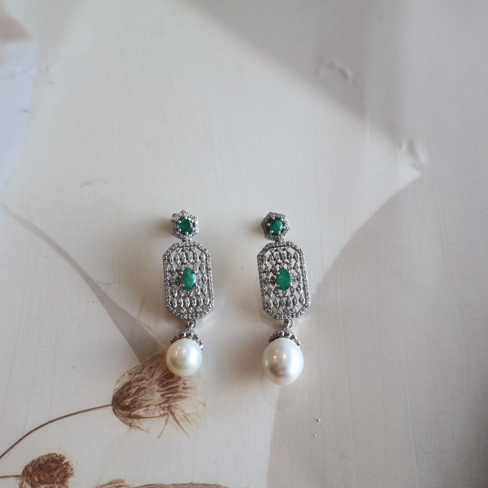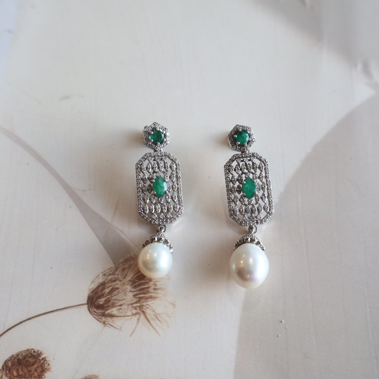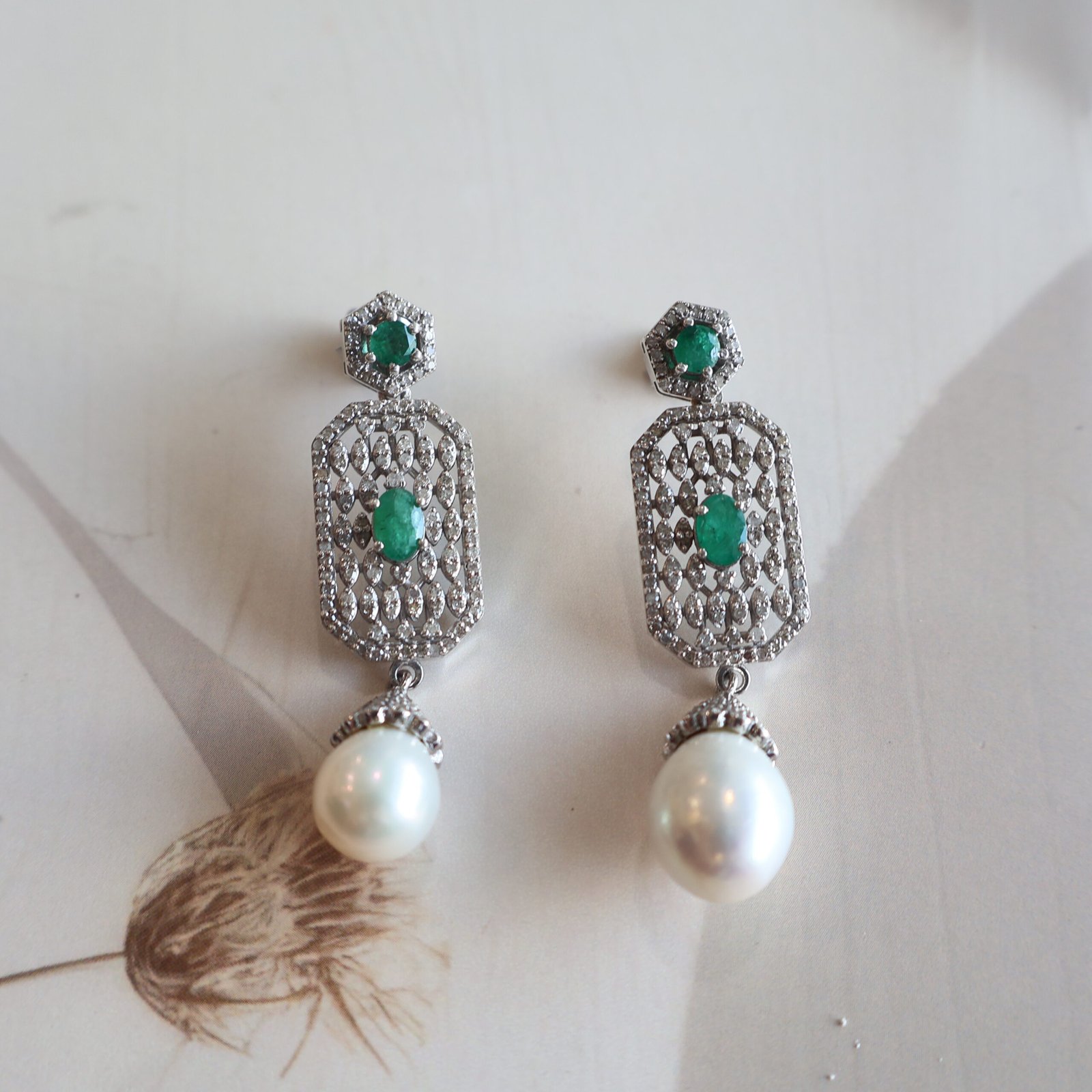 Elegant 92.5 silver earrings with diamonds, emeralds, and freshwater pearls for a timeless look.