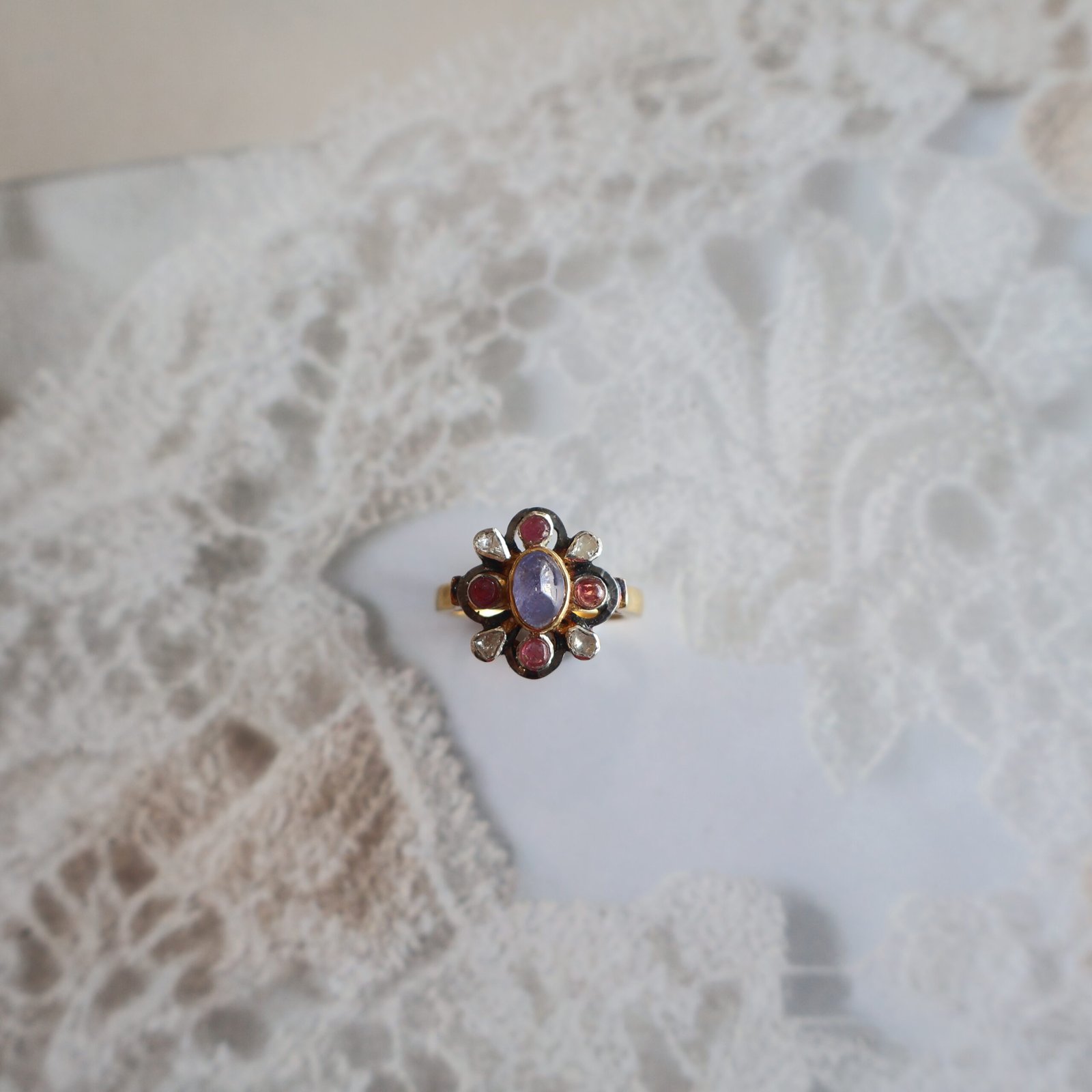 Make your style stand out with this stunning Natural Diamond Polki, Tourmaline & Tanzanite Ring from Tribe By Shringar. Designed for women who love premium gemstone jewellery, this ring features shimmering natural diamond polkies combined with colorful tourmaline gemstones and the rich royal glow of tanzanite stones, creating a bold yet elegant luxury design.