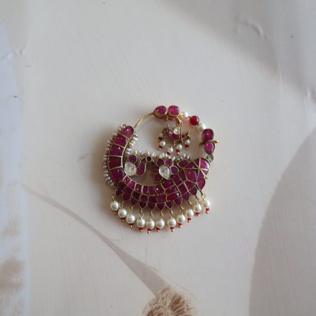 Designed especially for bridal and ceremonial wear, this nath reflects a perfect blend of heritage charm and refined luxury. Lightweight and comfortable, it complements bridal lehengas, sarees, and traditional ensembles, making it a statement piece that embodies timeless elegance.