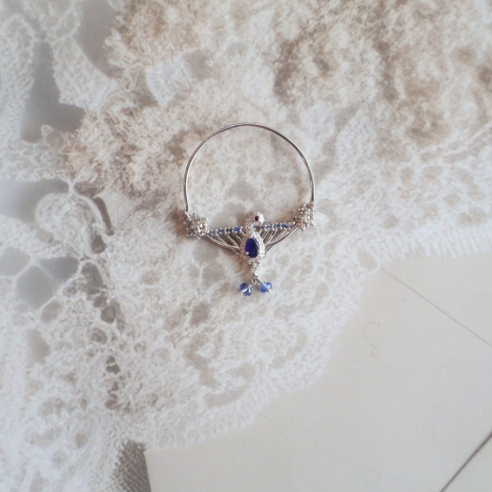 This exquisitely handcrafted 92.5 silver nath celebrates traditional artistry and symbolic elegance. Embellished with sparkling natural diamonds and rich blue sapphires, the design is further enhanced by finely detailed peacock motifs, a symbol of grace, beauty, and prosperity.