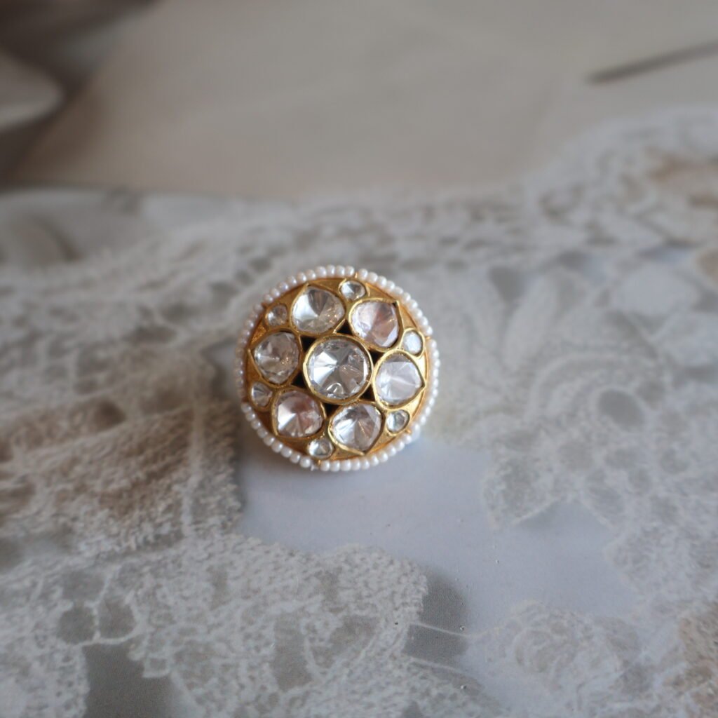 This exquisitely handcrafted 92.5 silver nath reflects the beauty of classic Indian jewellery traditions. Adorned with luminous natural diamond polkies, it offers a soft, heritage-inspired sparkle, while carefully set rubies add a bold and regal accent to the design.