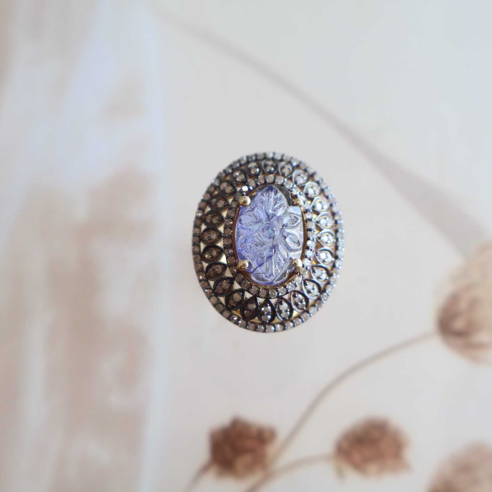 92.5 silver ring with carved tanzanites and diamond accents, crafted for an elegant and artistic look.