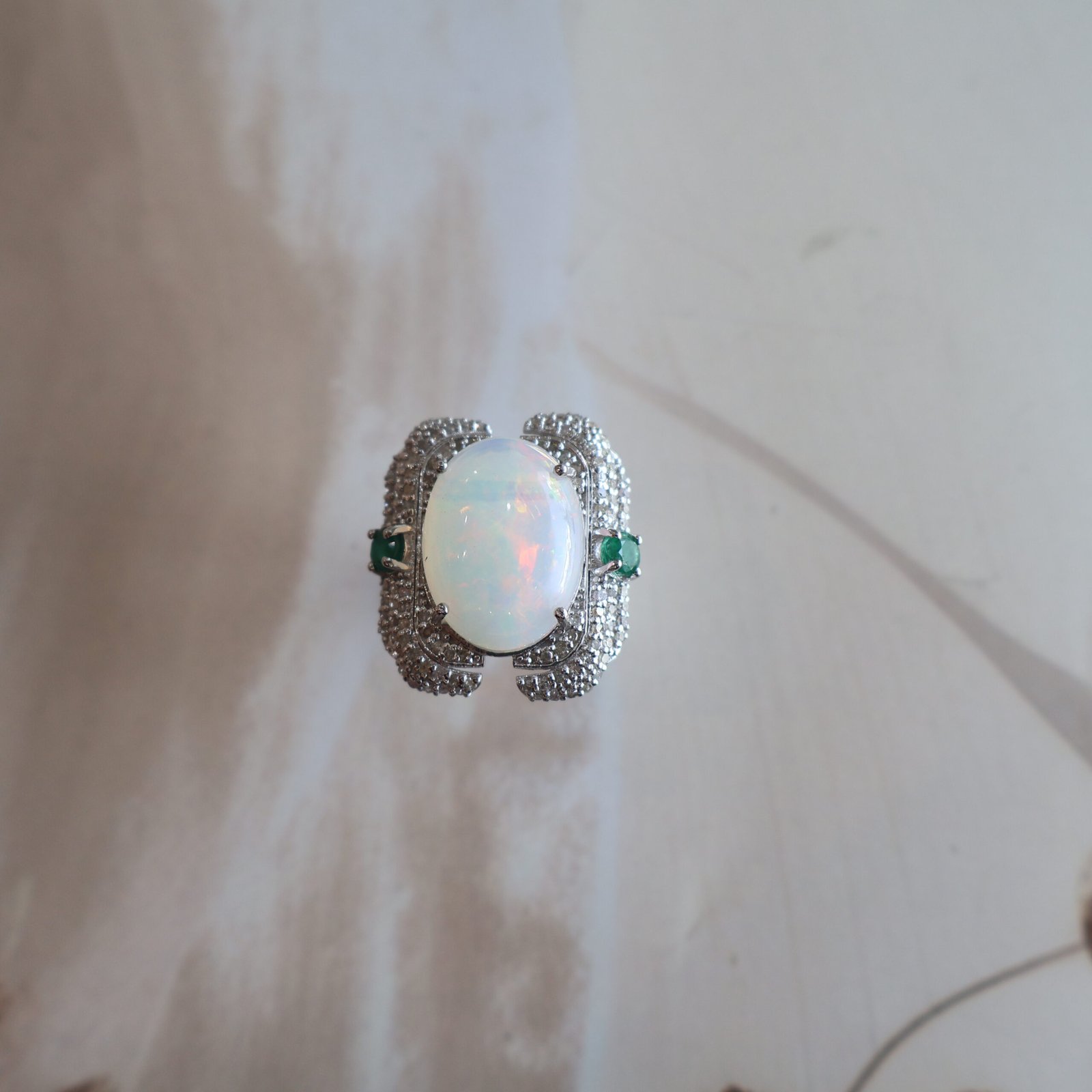 Elegant 92.5 silver ring featuring opal, emeralds, and diamond accents for a refined, luxurious look.