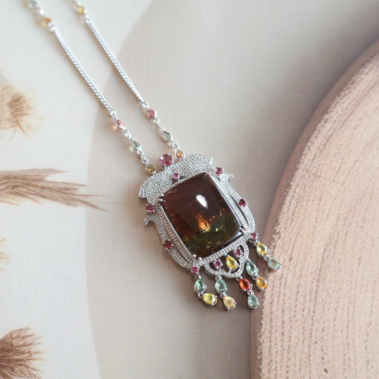 Elegant 92.5 silver diamond set with multicolour stones, tourmalines, and diamonds for a bold, luxurious look.