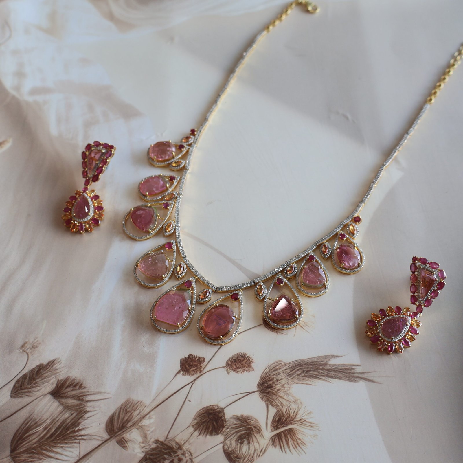 This elegant jewellery set is made from 92.5 pure silver and comes with matching earrings. It is beautifully decorated with sparkling diamond stones, colourful tourmaline stones, and rich red ruby stones, creating a vibrant and classy look. The smooth silver finish makes it comfortable to wear all day. This set is perfect for weddings, festivals, parties, and other special occasions.