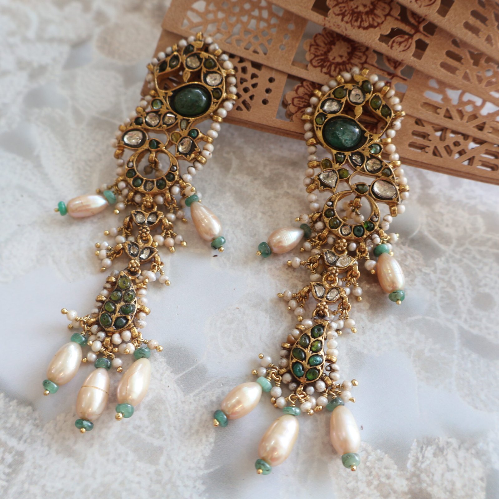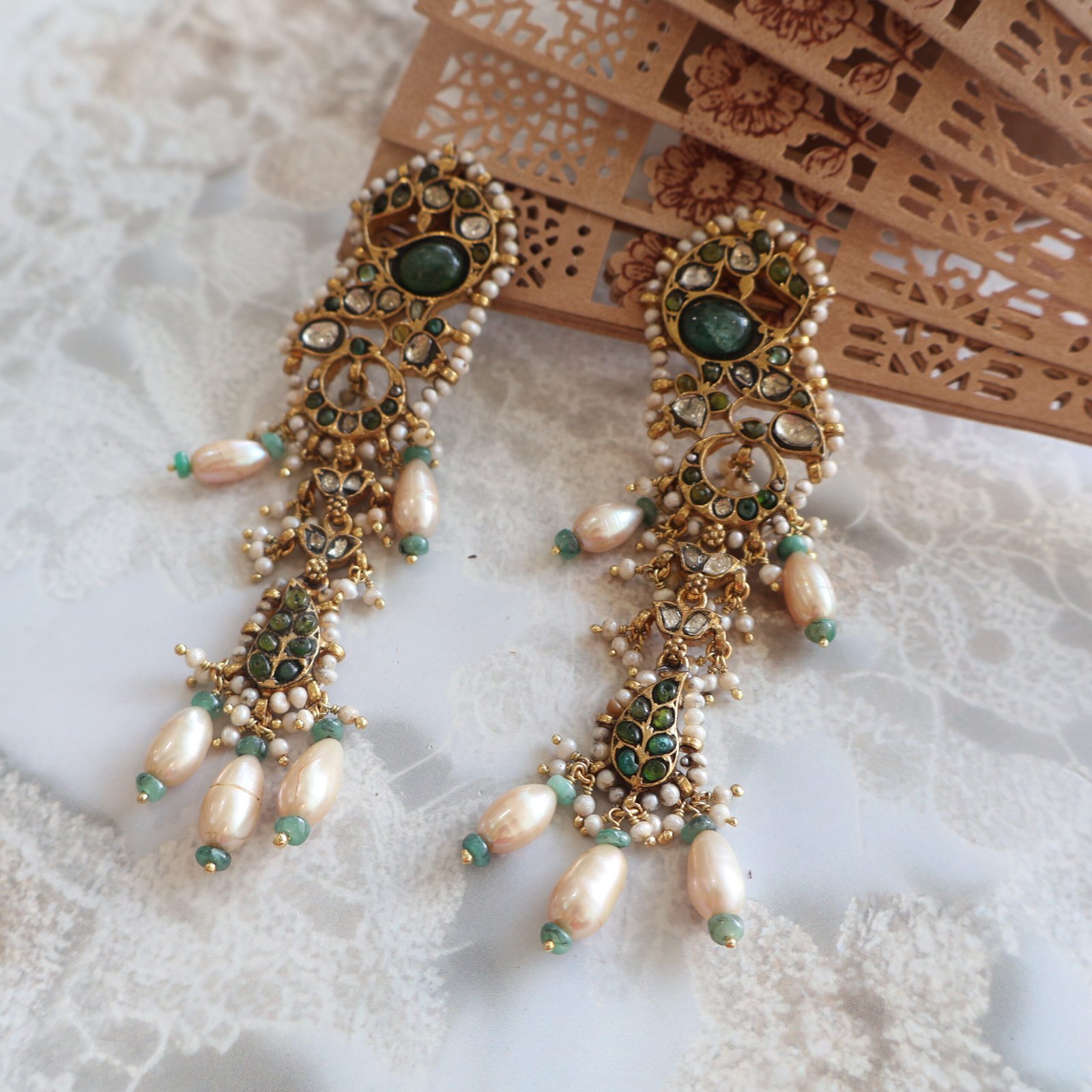 These exquisite 92.5 sterling silver earrings are a celebration of refined craftsmanship and classic elegance. Beautifully studded with radiant diamond polkies, soft-glowing freshwater pearls, and carefully selected precious and semi-precious gemstones, the design offers a perfect balance of sparkle, colour, and grace.