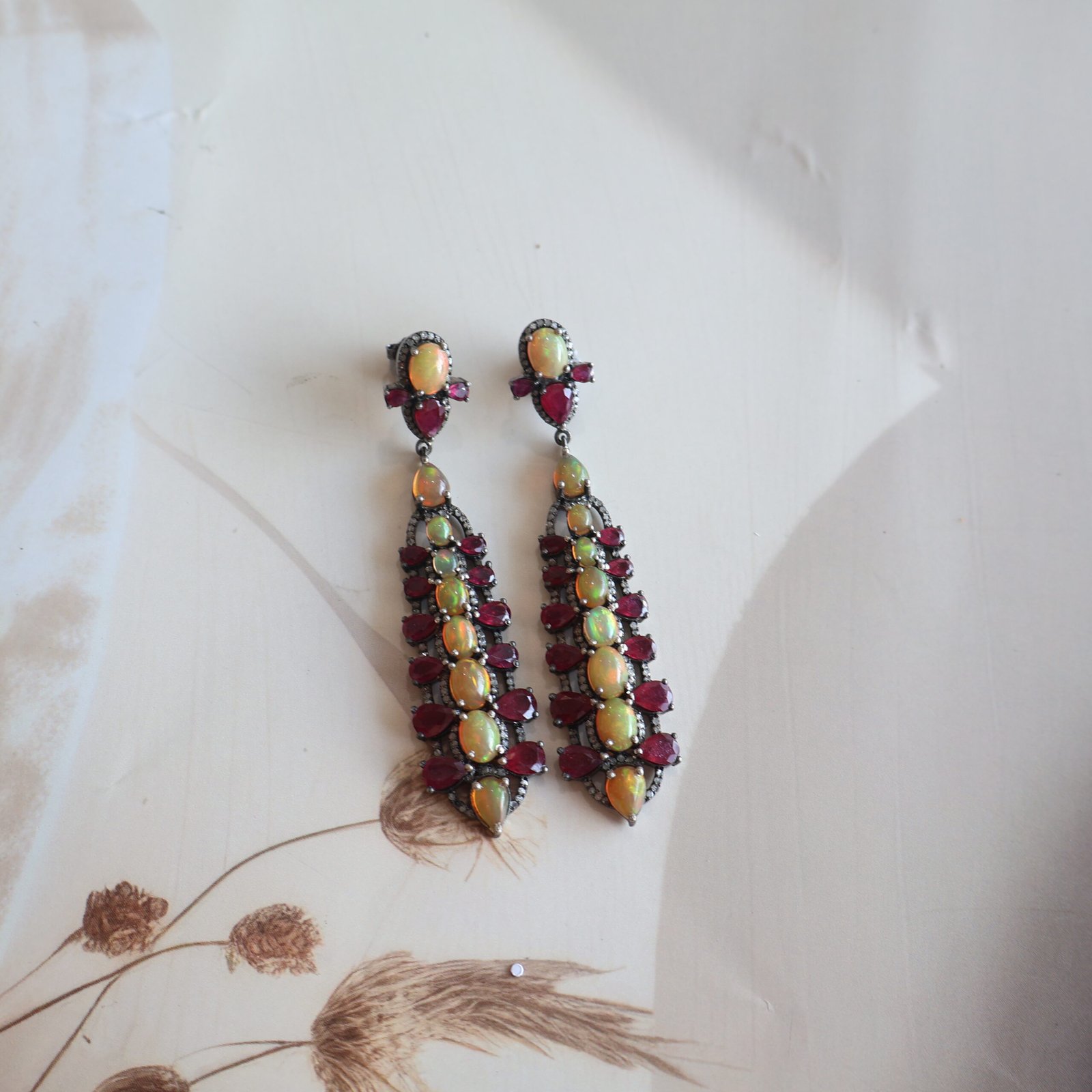 These beautifully handcrafted 92.5 sterling silver earrings showcase a captivating blend of gemstones. The soft iridescence of opals brings an ethereal charm, perfectly balanced by the rich colour of rubies and the refined brilliance of diamonds. Together, they create a design that is both elegant and striking.