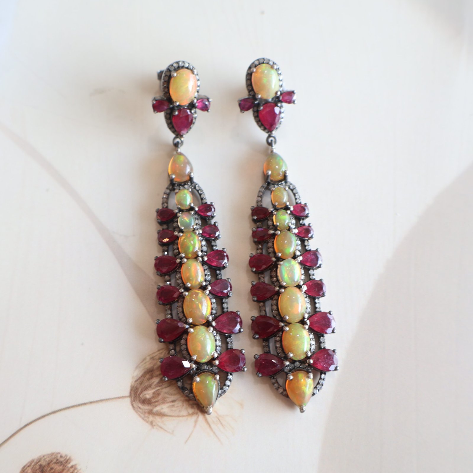 Elegant 92.5 sterling silver earrings adorned with luminous opals, vibrant rubies, and sparkling diamonds for a timeless, regal look