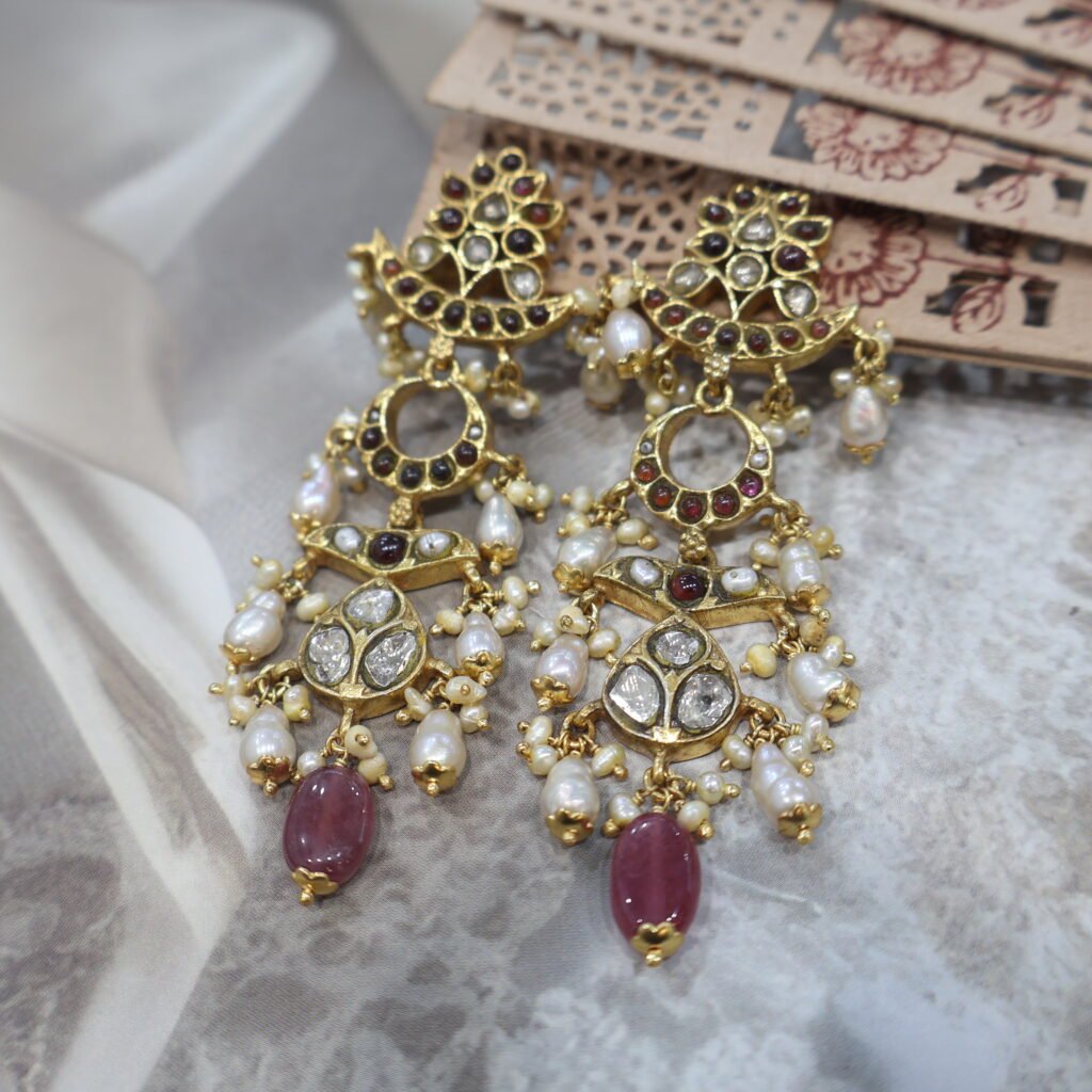 These exquisite 92.5 sterling silver earrings are a celebration of refined craftsmanship and classic elegance. Beautifully studded with radiant diamond polkies, soft-glowing freshwater pearls, and carefully selected precious and semi-precious gemstones, the design offers a perfect balance of sparkle, colour, and grace.