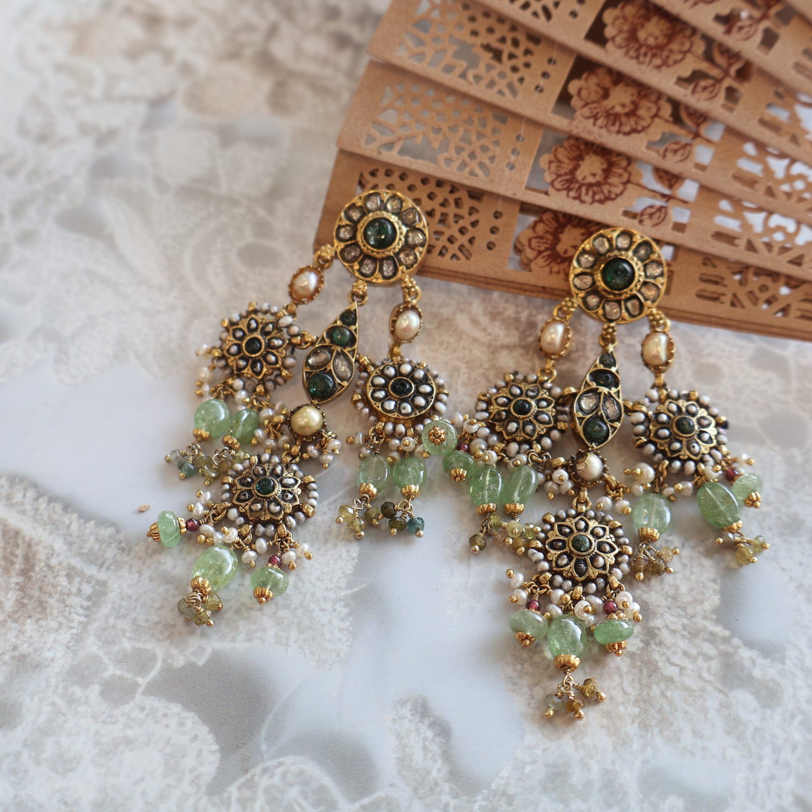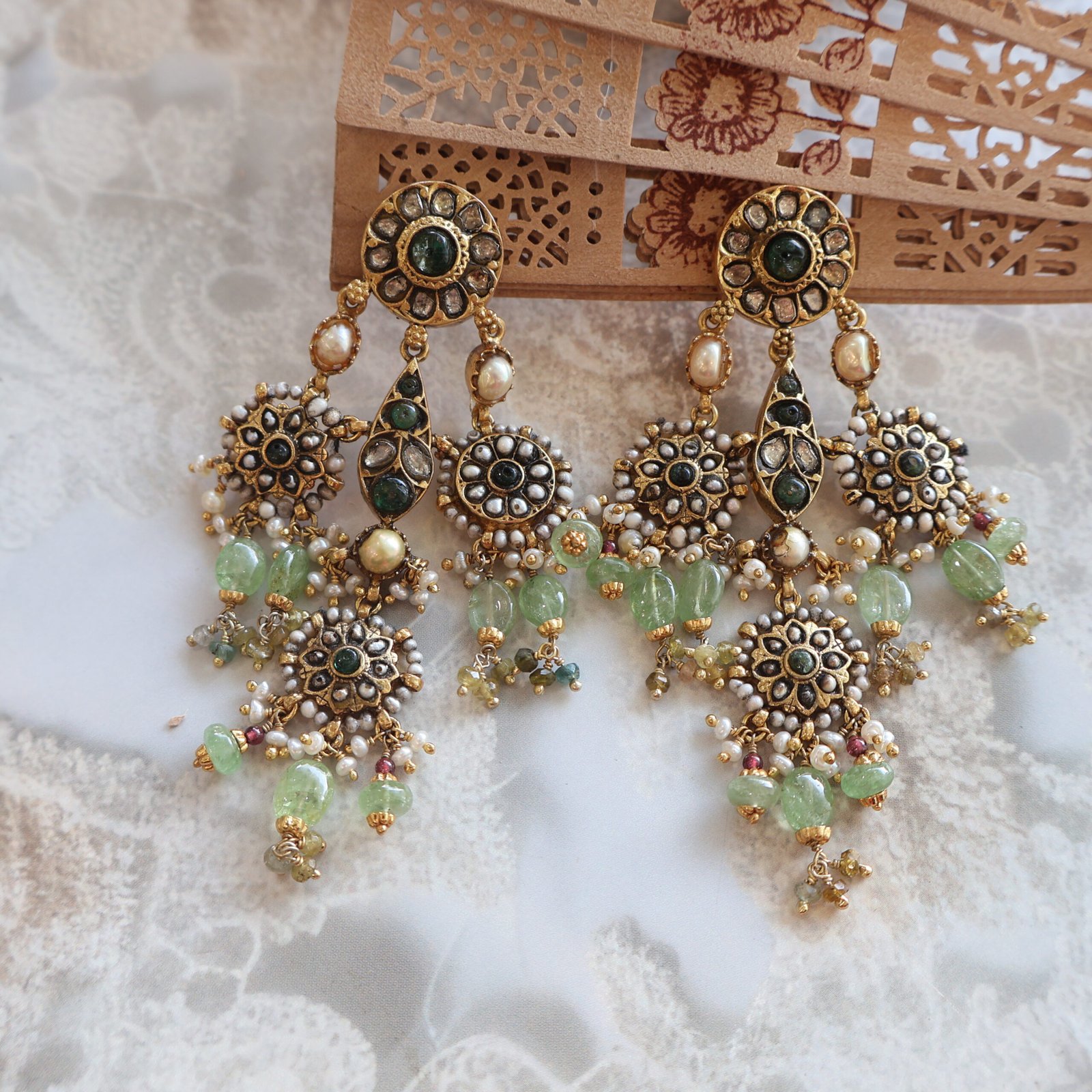 Elegant 92.5 sterling silver earrings adorned with sparkling diamond polkies, lustrous freshwater pearls, and a blend of precious and semi-precious gemstones, crafted for timeless sophistication.