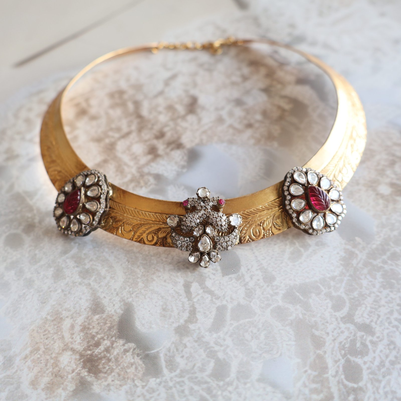 A regal 92.5 sterling silver hasli set with matching earrings, exquisitely studded with moissanite polkies and finished in rich gold polish.