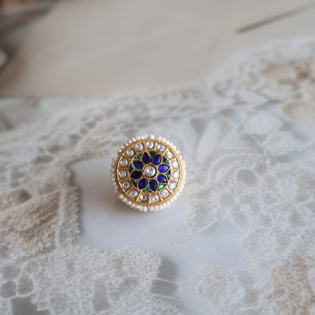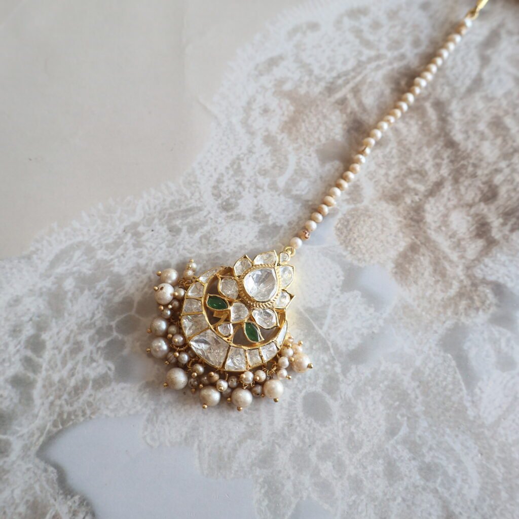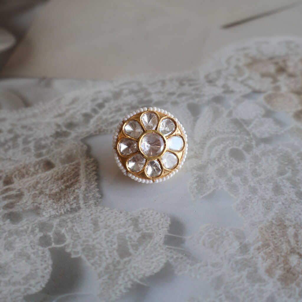 This elegant 92.5 sterling silver Nath is designed for lovers of minimal luxury. The subtle sparkle of monzonite polkiespaired with the soft sheen of freshwater pearls creates a refined, graceful look without excess.
