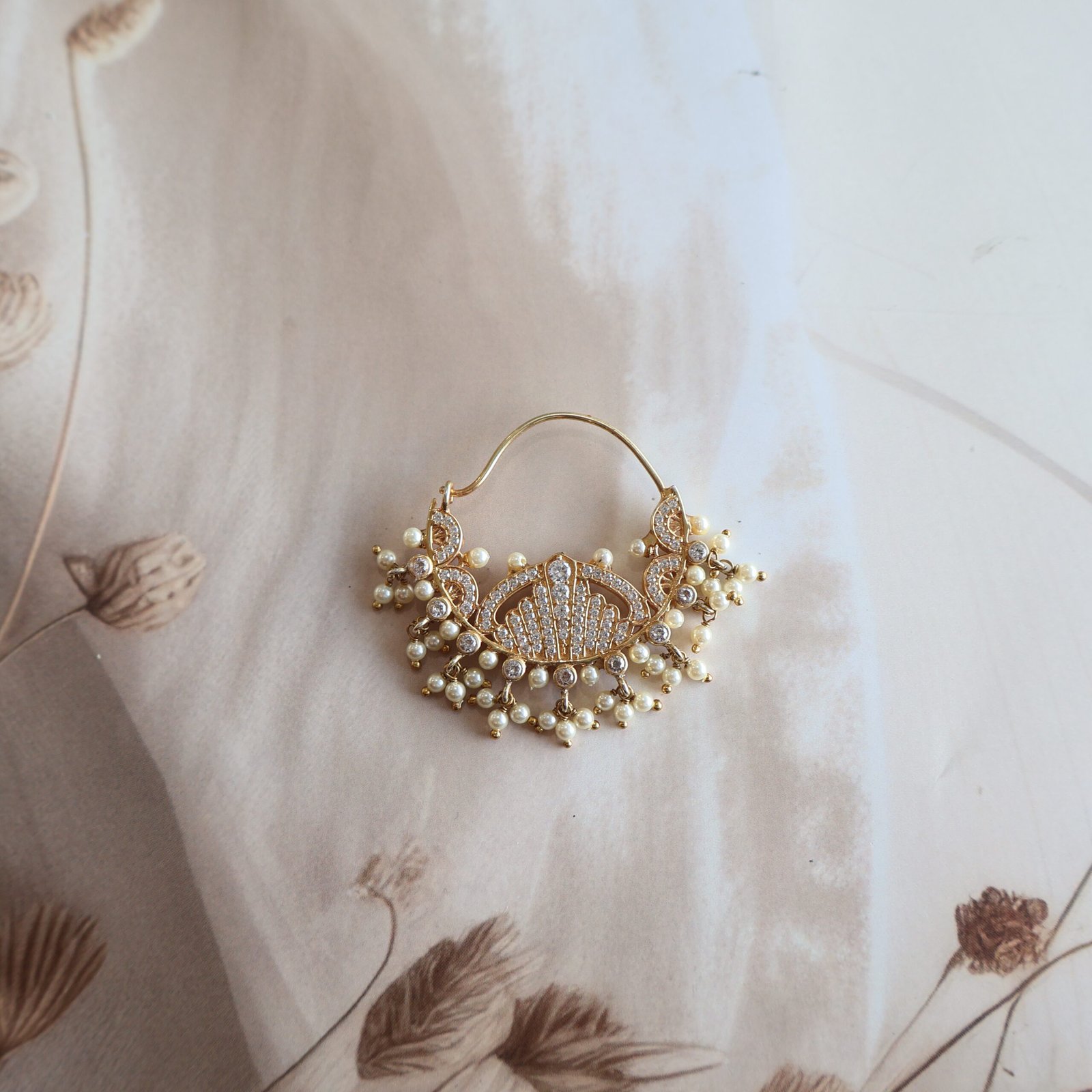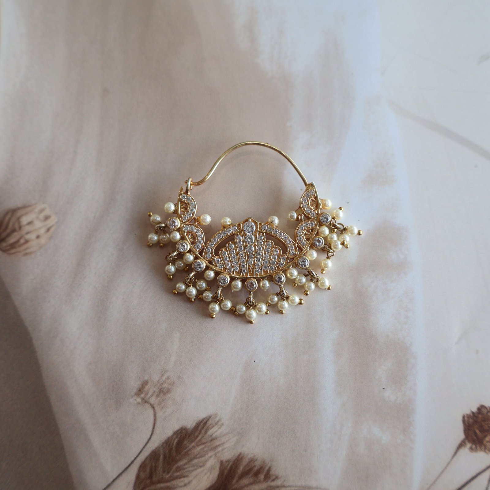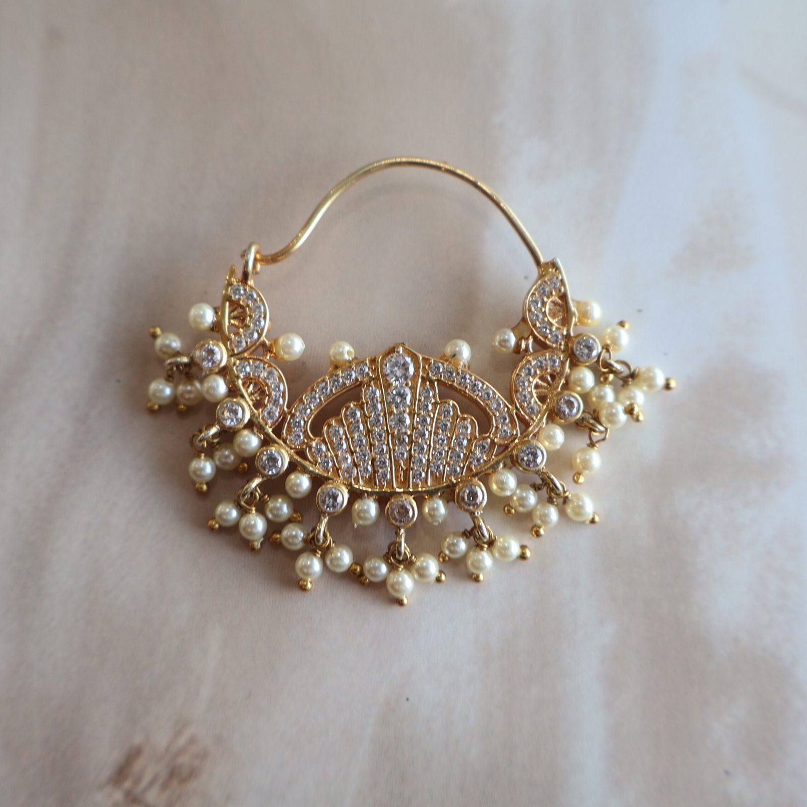 Elegant Nath adorned with shimmering cizinite stones and soft freshwater pearls, crafted for timeless bridal elegance.