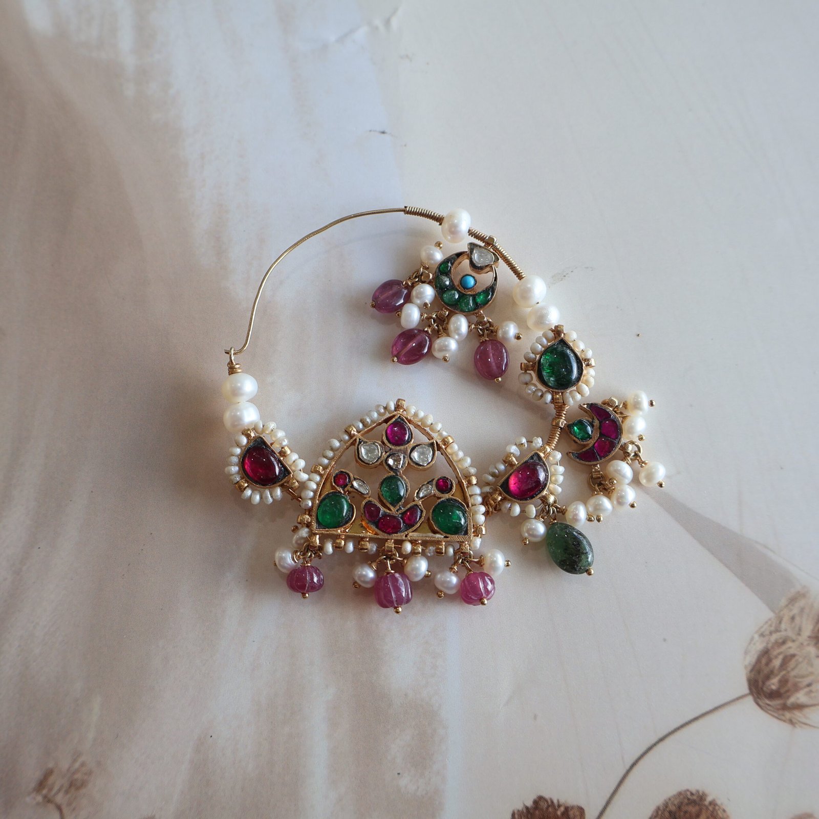 Statement 92.5 silver Nath embellished with emeralds, rubies, polkies, and natural gemstones for a bold yet elegant look.