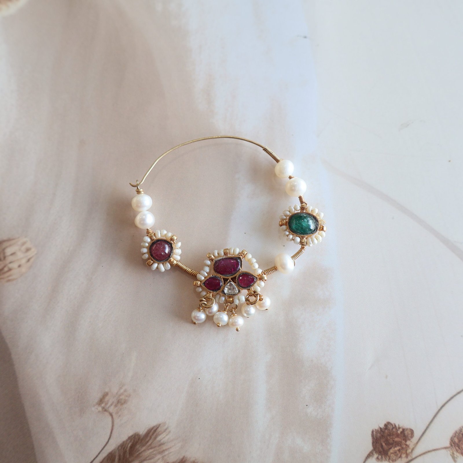 This delicately crafted 92.5 sterling silver Nath is perfect for those who seek elegance without heaviness. Featuring finely set emeralds, rubies, sparkling polkies, and natural gemstones, it offers a soft yet luxurious glow.