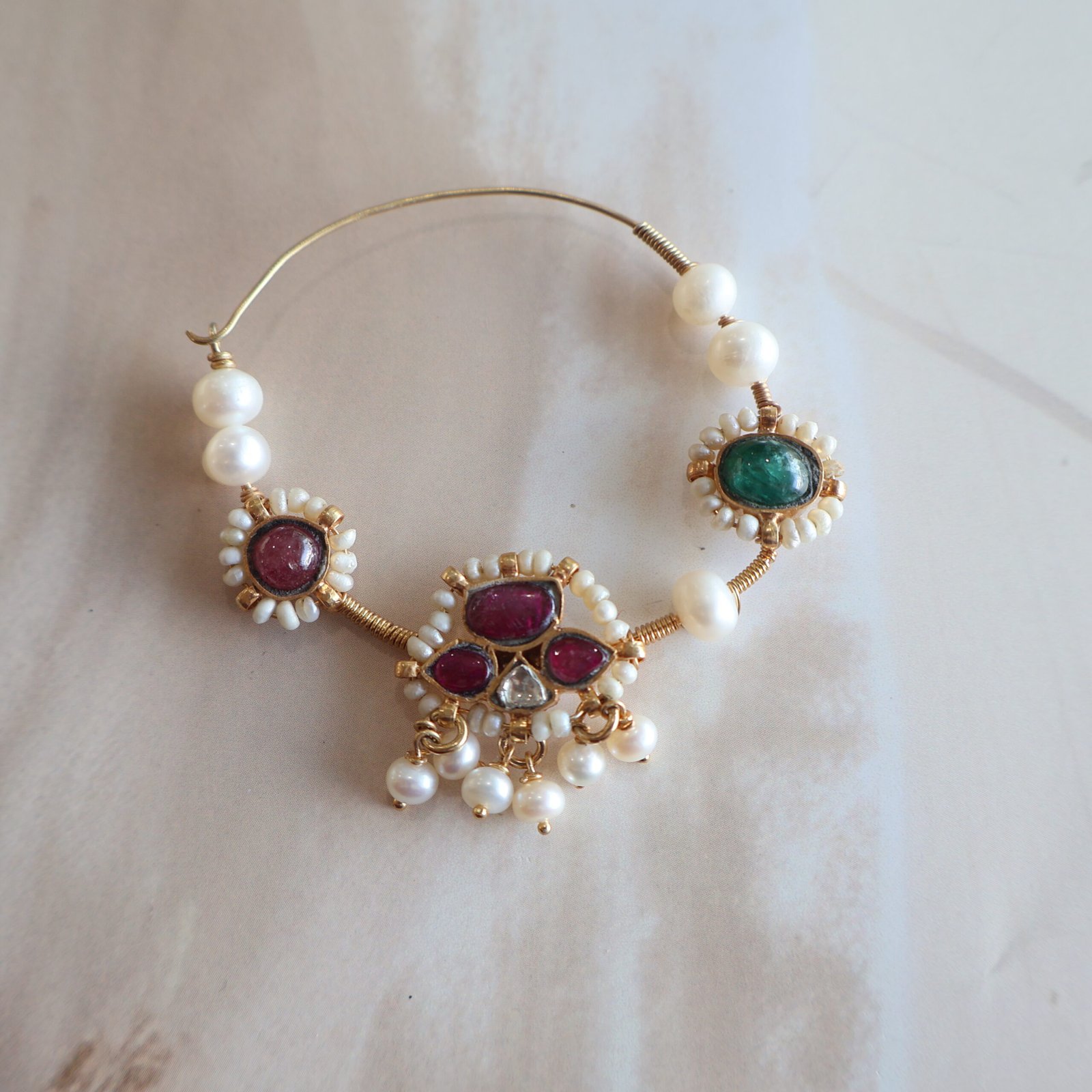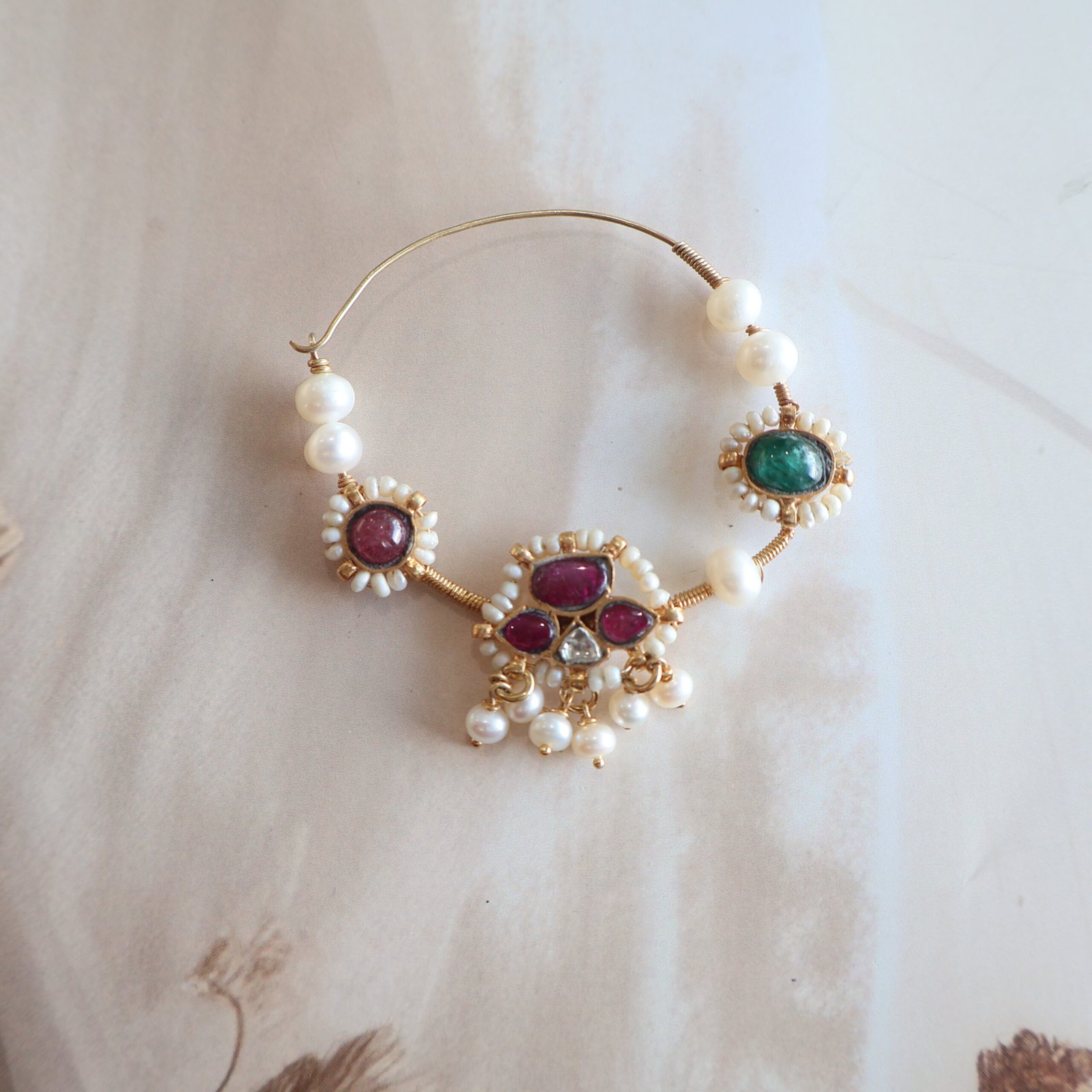 Graceful 92.5 silver Nath with emeralds, rubies, polkies, and natural gemstones, designed for effortless elegance.