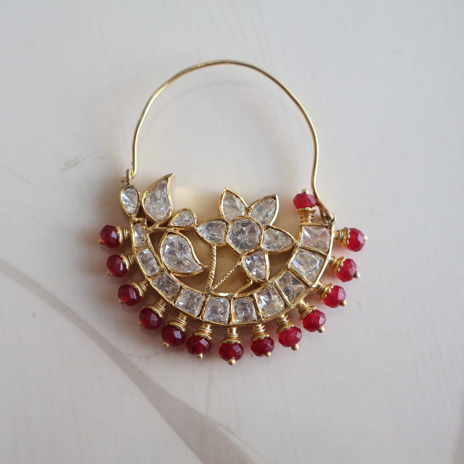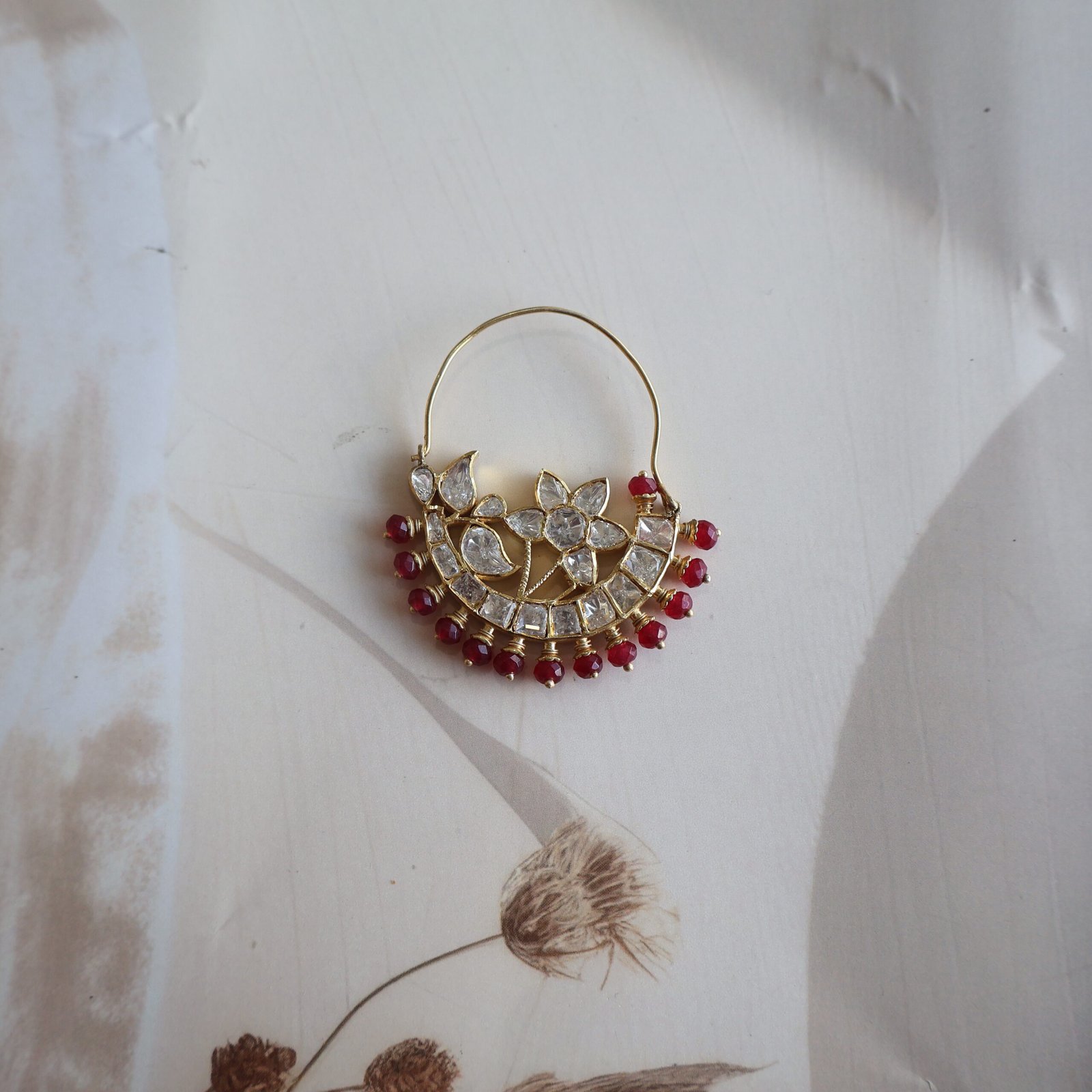 The polished silver base enhances durability while ensuring comfortable wear throughout long ceremonies. Designed to complement traditional bridal ensembles, this Nath is a refined heirloom piece that celebrates heritage craftsmanship.