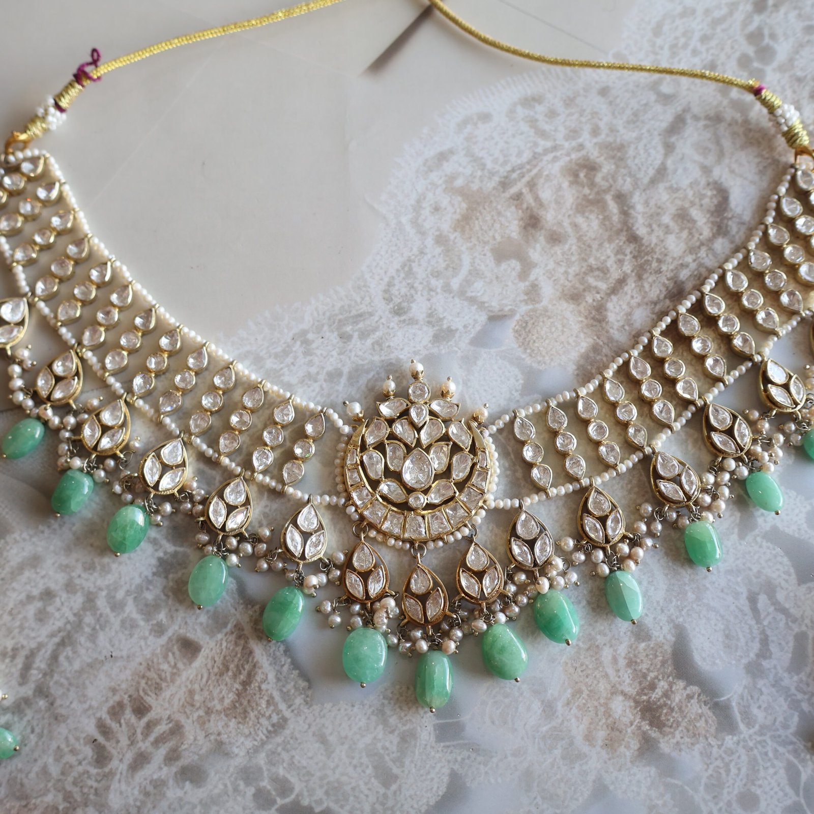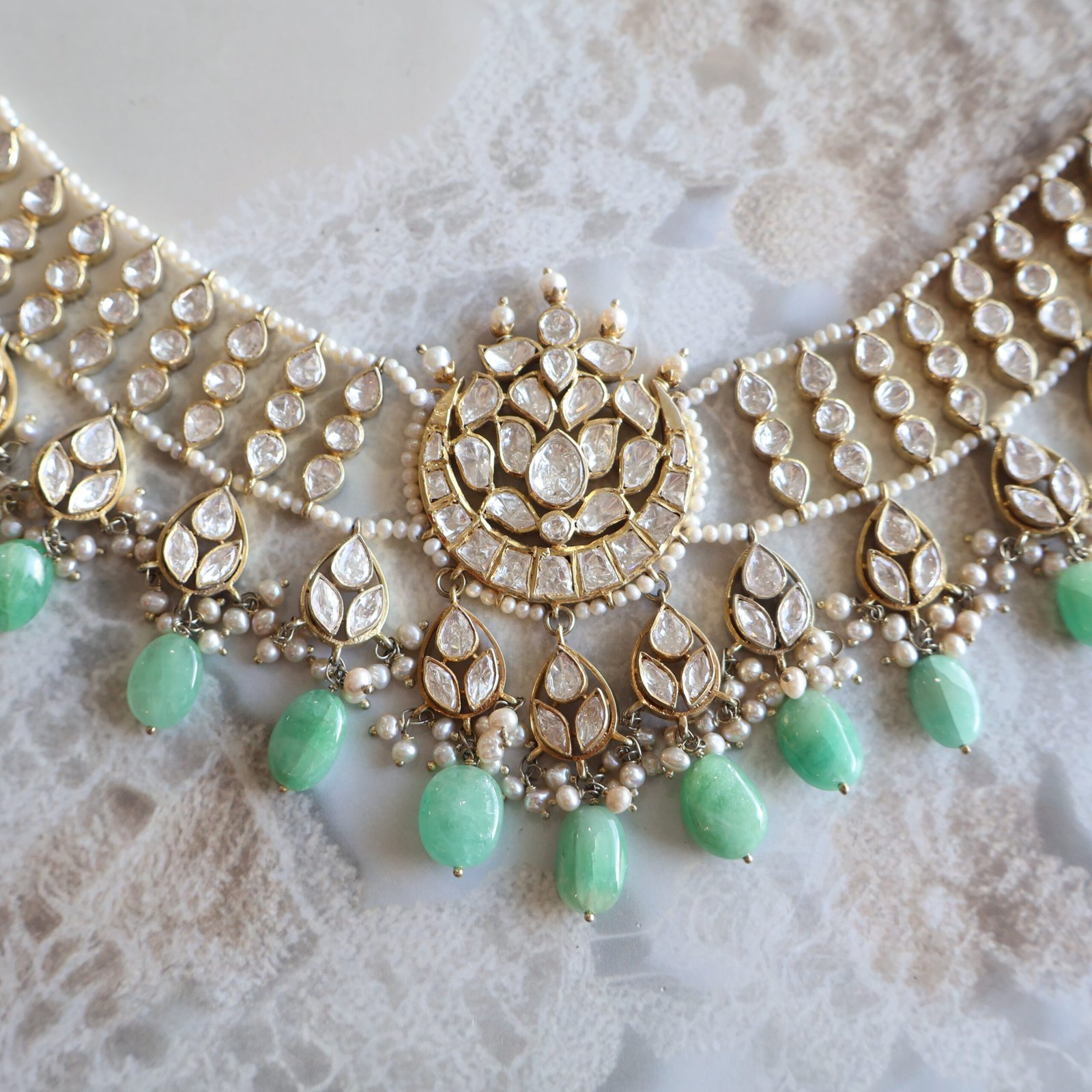 92.5 silver jewellery set studded with moissanite polkies, emeralds, and freshwater pearls, finished with gold polish for a rich royal look.