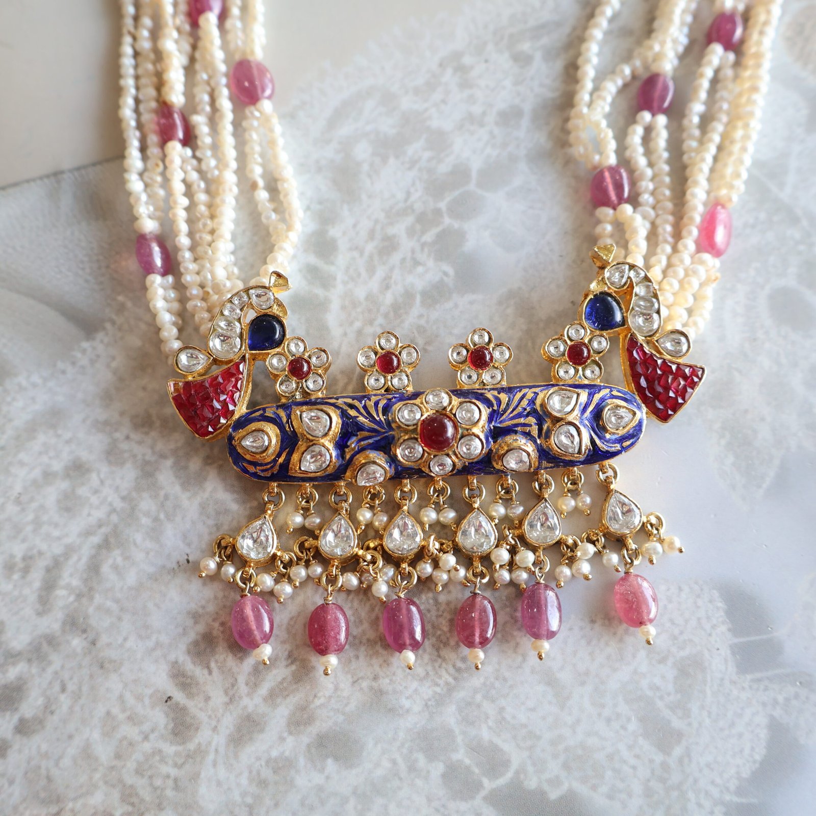 • Studded with rubies, kundan stones, and freshwater pearls