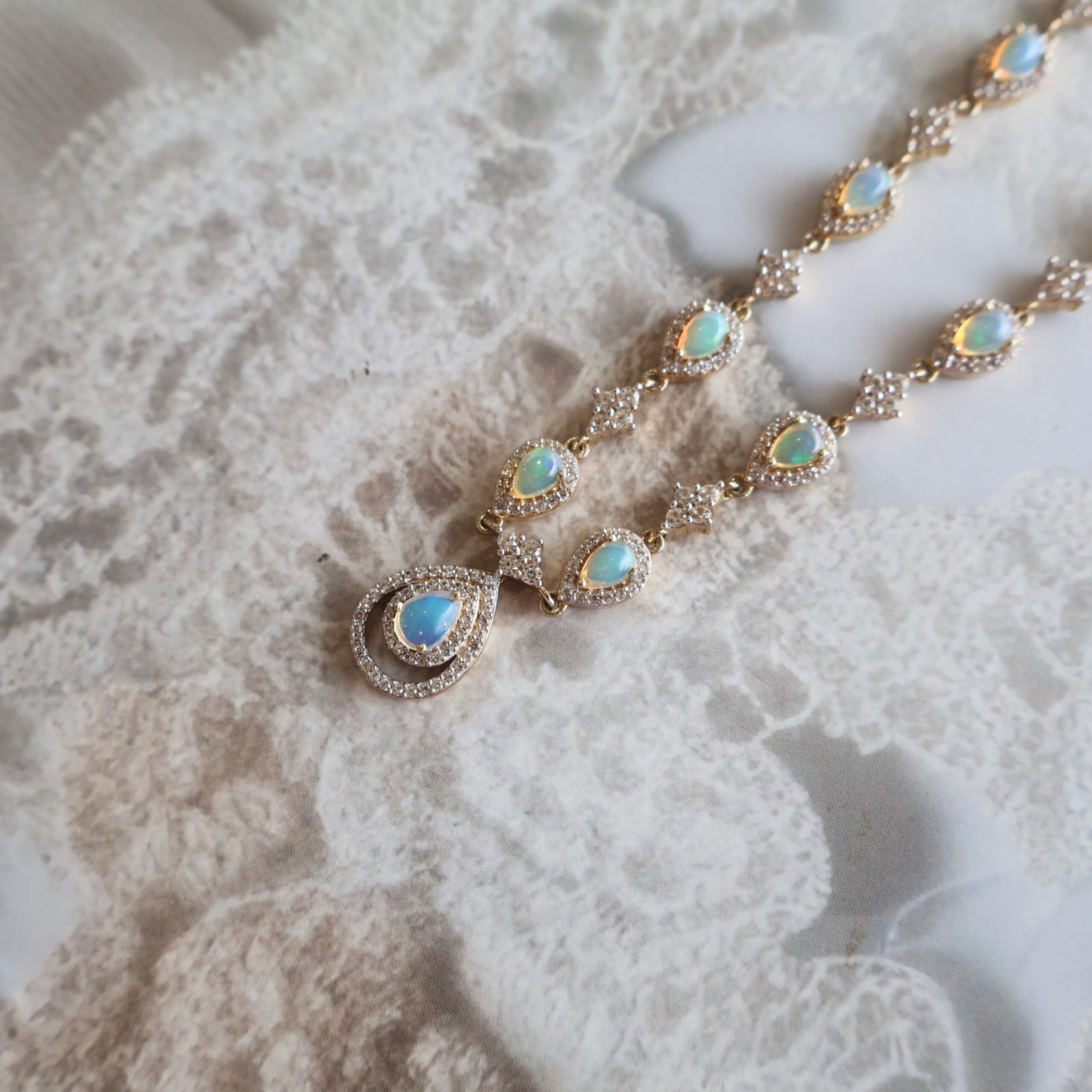 This exquisite jewellery piece is crafted in 92.5 pure silver and enhanced with rich gold polish for a warm, luxurious glow. It is beautifully adorned with luminous opal stones and sparkling zircon stones, creating a graceful blend of soft iridescence and radiant brilliance. The gentle play of colours in the opal pairs perfectly with the shine of zircons, while the golden finish adds a royal touch. Smoothly polished for comfortable wear, this piece is ideal for festive occasions, weddings, and special celebrations.