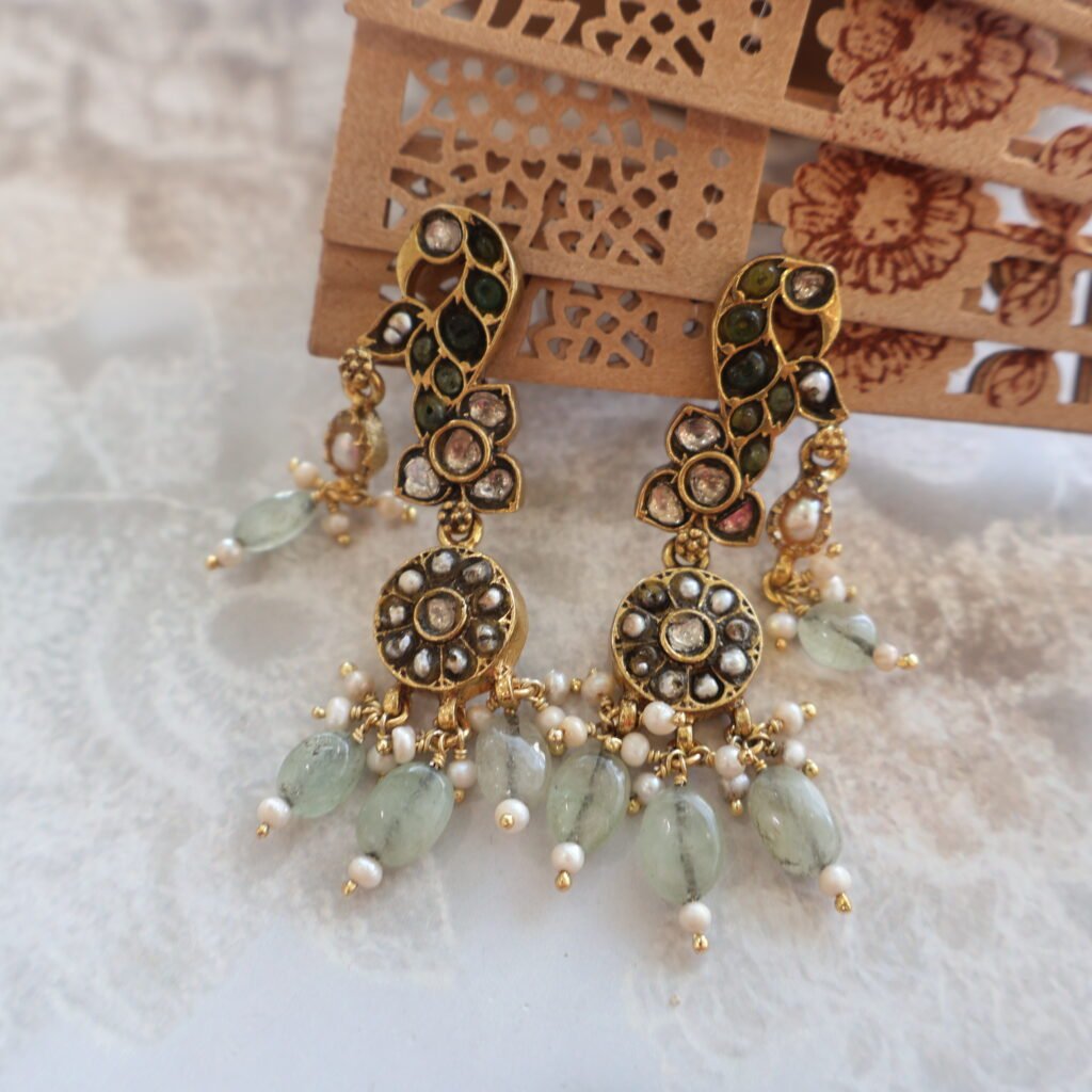 Elegant 92.5 sterling silver earrings adorned with sparkling diamond polkies, lustrous freshwater pearls, and a blend of precious and semi-precious gemstones, crafted for timeless sophistication.