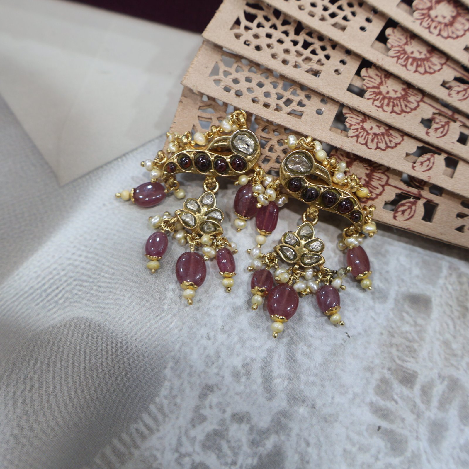 Elegant 92.5 sterling silver earrings adorned with sparkling diamond polkies, lustrous freshwater pearls, and a blend of precious and semi-precious gemstones, crafted for timeless sophistication.