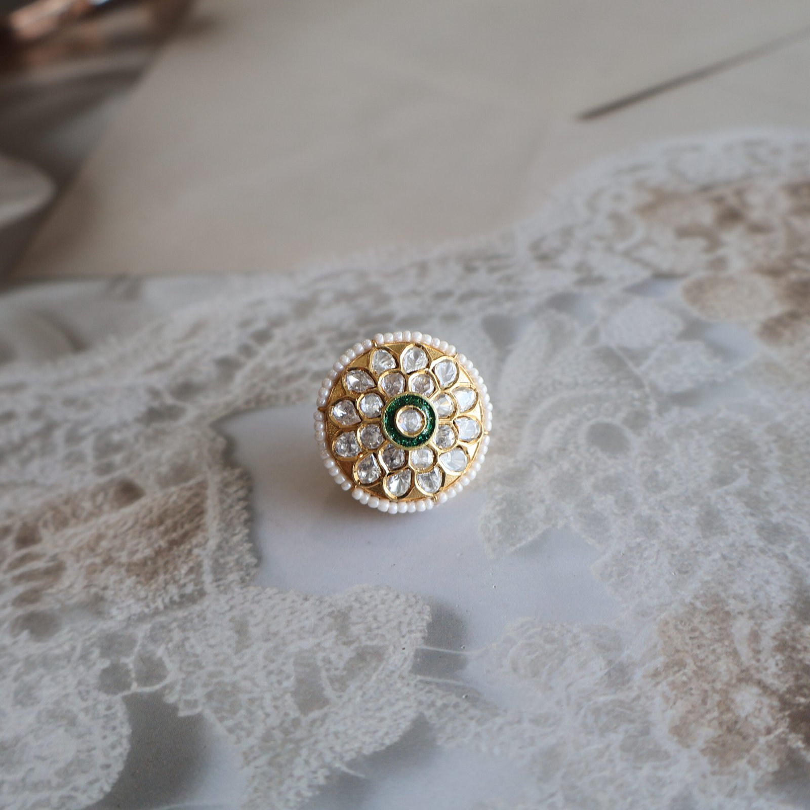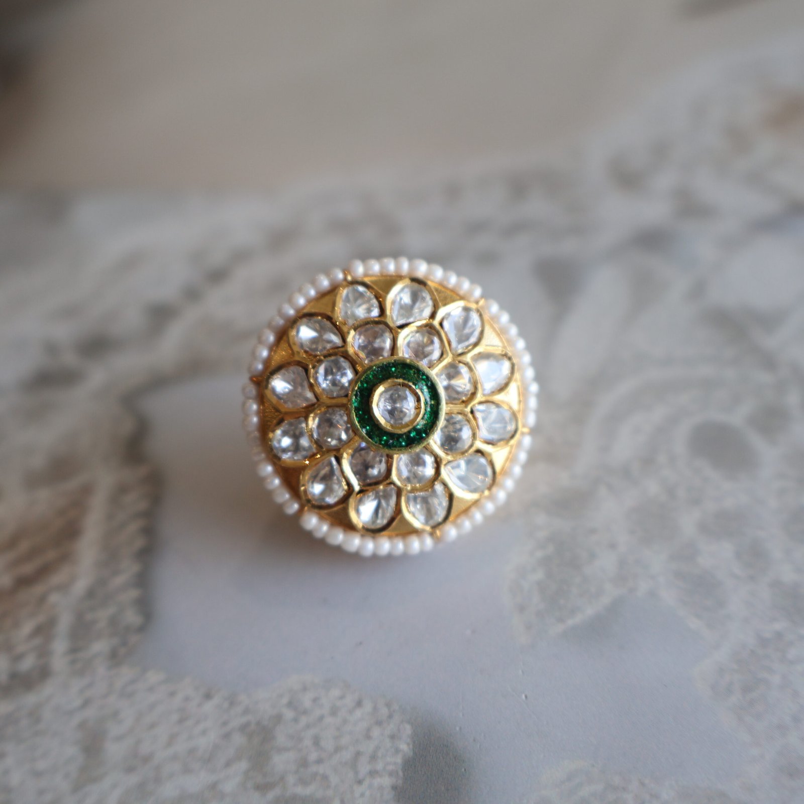 Designed for lovers of understated luxury, this 92.5 sterling silver Rakhdi showcases the subtle brilliance of monzonite polkies in a clean, elegant setting. The refined craftsmanship highlights each stone, creating a graceful look without excess.
