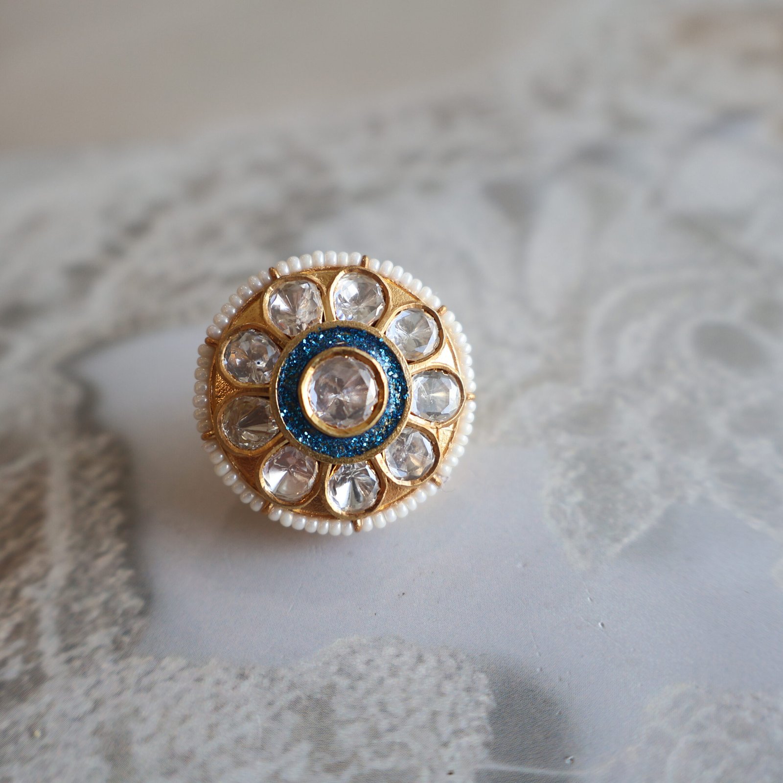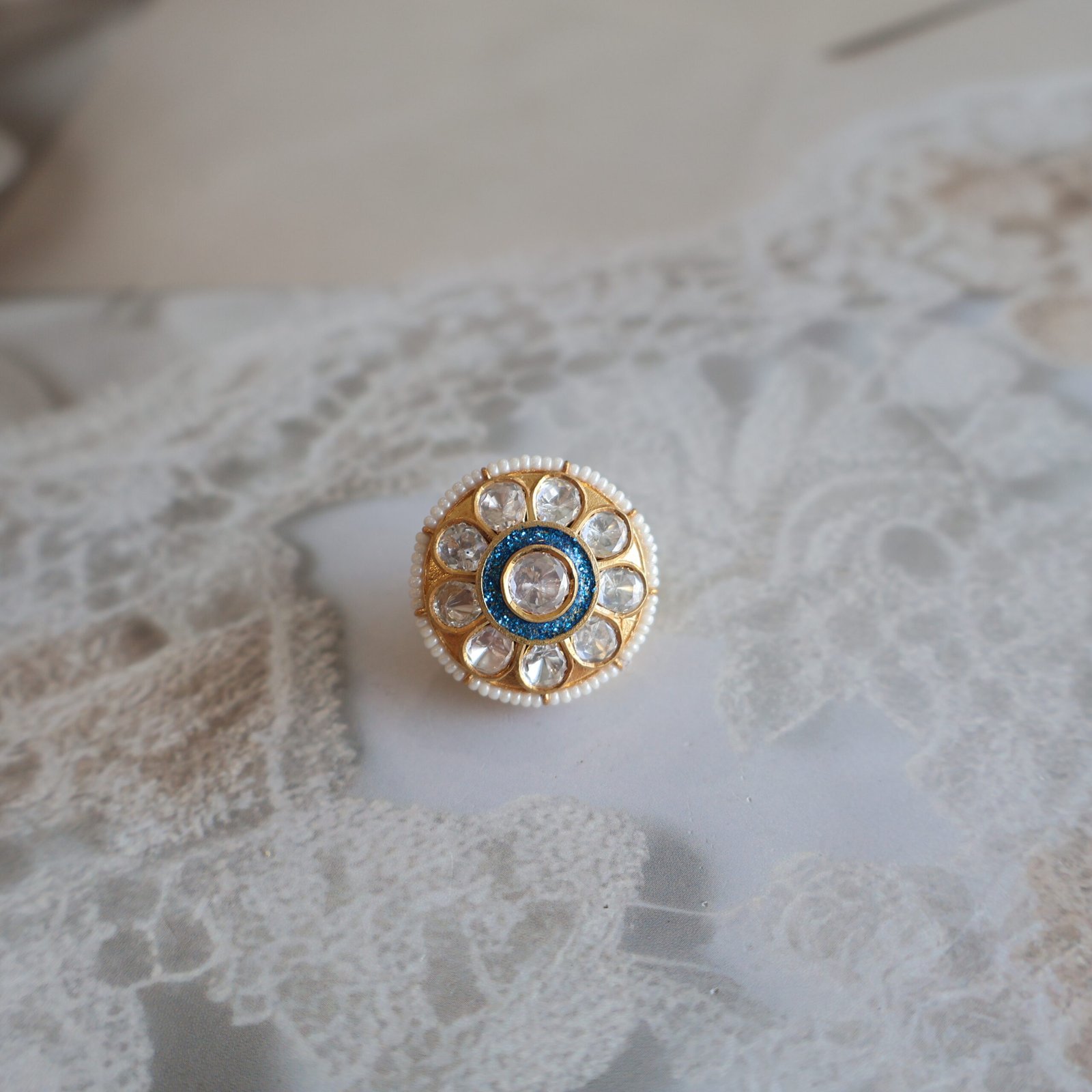 Inspired by vintage royal jewellery, this 92.5 sterling silver Rakhdi features intricately placed monzonite polkies that evoke timeless charm. The antique-inspired design and subtle sparkle make it a statement piece rooted in tradition.