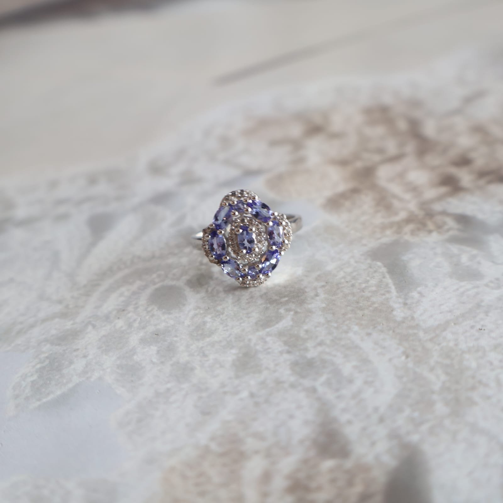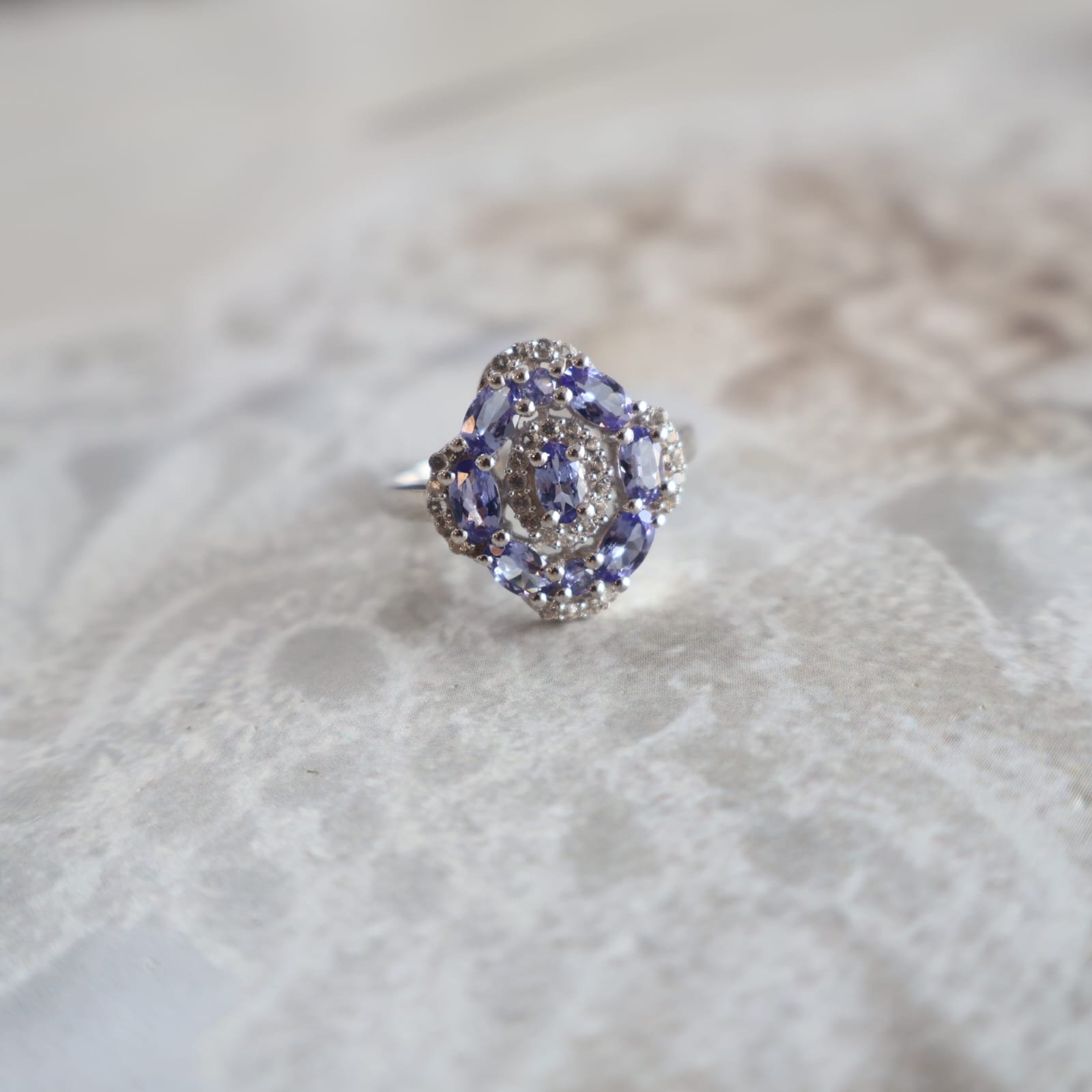 92.5 silver ring featuring tanzanite and shimmering zircons for a luxurious and radiant look.