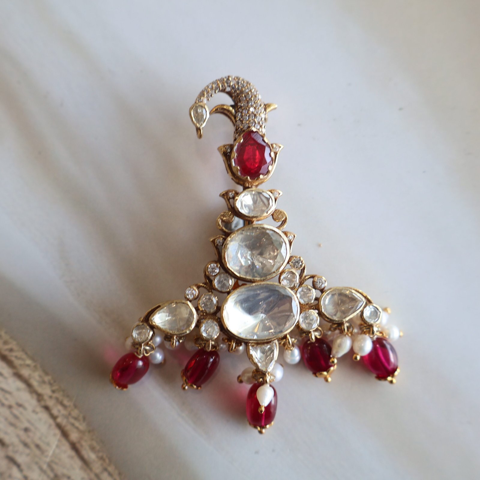This regal 92.5 silver sarpech is a celebration of heritage craftsmanship and royal aesthetics. Featuring hand-set moissanite polkies that reflect brilliant light, the design is elevated by striking colour stones that add depth and character. Softly glowing freshwater pearls lend a graceful finish, enhancing its timeless appeal.